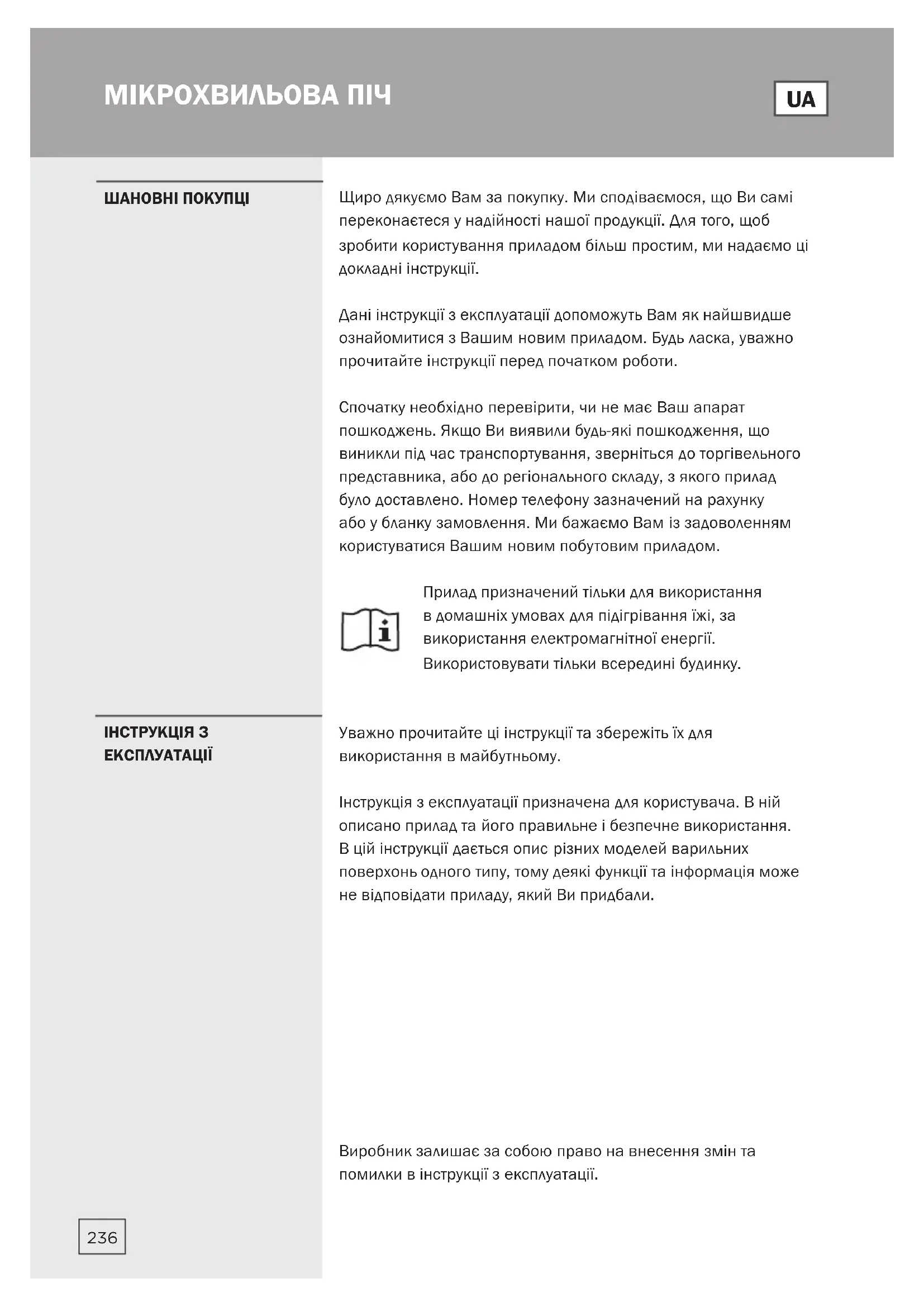 FØR DU TILKALDER HJÆLPЩиро дякуємо Вам за покупку. Ми сподіваємося, що Ви самі переконаєтеся у надійності нашої продукції. Для того, щоб зробити користування приладом більш простим, ми надаємо ці докладні інструкції. Дані інструкції з експлуатації допоможуть Вам як найшвидше ознайомитися з Вашим новим приладом. Будь ласка, уважно прочитайте інструкції перед початком роботи. Спочатку необхідно перевірити, чи не має Ваш апарат пошкоджень. Якщо Ви виявили будь-які пошкодження, що виникли під час транспортування, зверніться до торгівельного представника, або до регіонального складу, з якого прилад було доставлено. Номер телефону зазначений на рахунку або у бланку замовлення. Ми бажаємо Вам із задоволенням користуватися Вашим новим побутовим приладом. Прилад призначений тільки для використання в домашніх умовах для підігрівання їжі, за використання електромагнітної енергії. Використовувати тільки всередині будинку. Уважно прочитайте ці інструкції та збережіть їх для використання в майбутньому. Інструкція з експлуатації призначена для користувача. В ній описано прилад та його правильне і безпечне використання. В цій інструкції дається опис різних моделей варильних поверхонь одного типу, тому деякі функції та інформація може не відповідати приладу, який Ви придбали. Виробник залишає за собою право на внесення змін та помилки в інструкції з експлуатації. ШАНОВНІ ПОКУПЦІ ІНСТРУКЦІЯ З ЕКСПЛУАТАЦІЇ