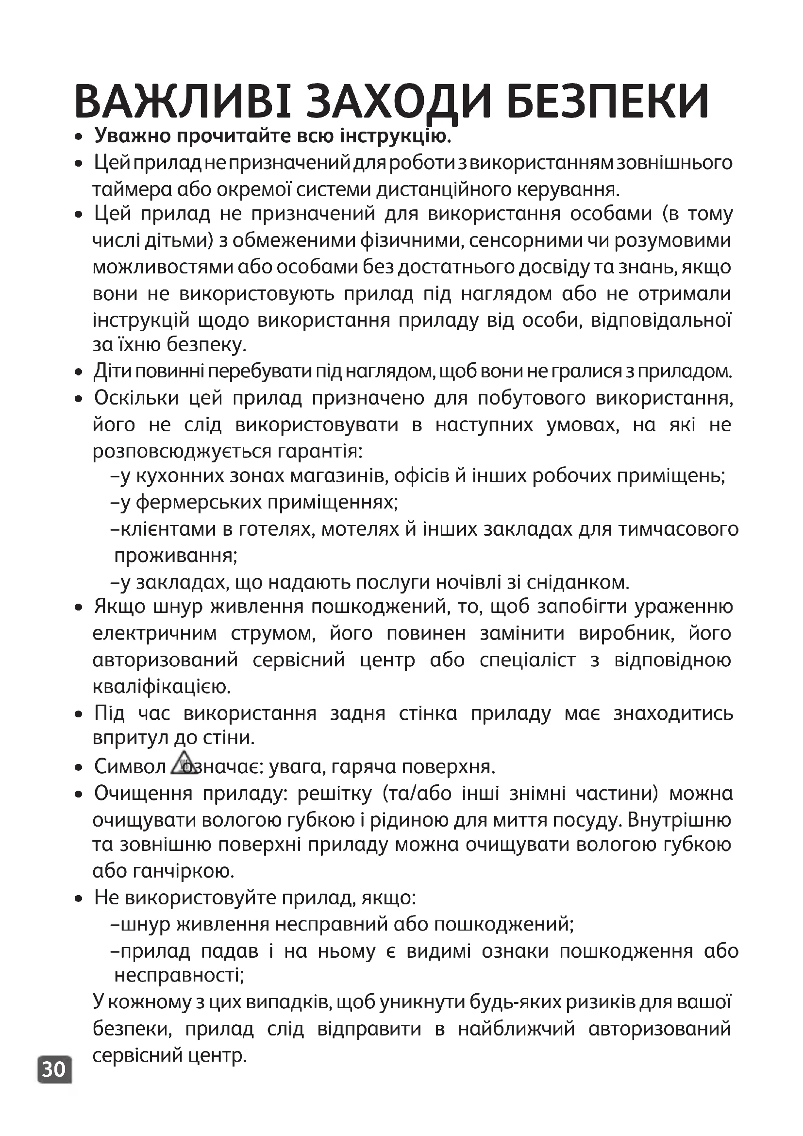 - Не використовуйте агресивні засоби для чищення (зокрема, засоби на основі соди), губки для миття посуду та металеві мочалки. Цей прилад призначений тільки для побутового використання. У разі будь-якого комерційного застосування, використання не за призначенням або недотримання інструкцій виробник не несе відповідальності і не надає жодних гарантій.