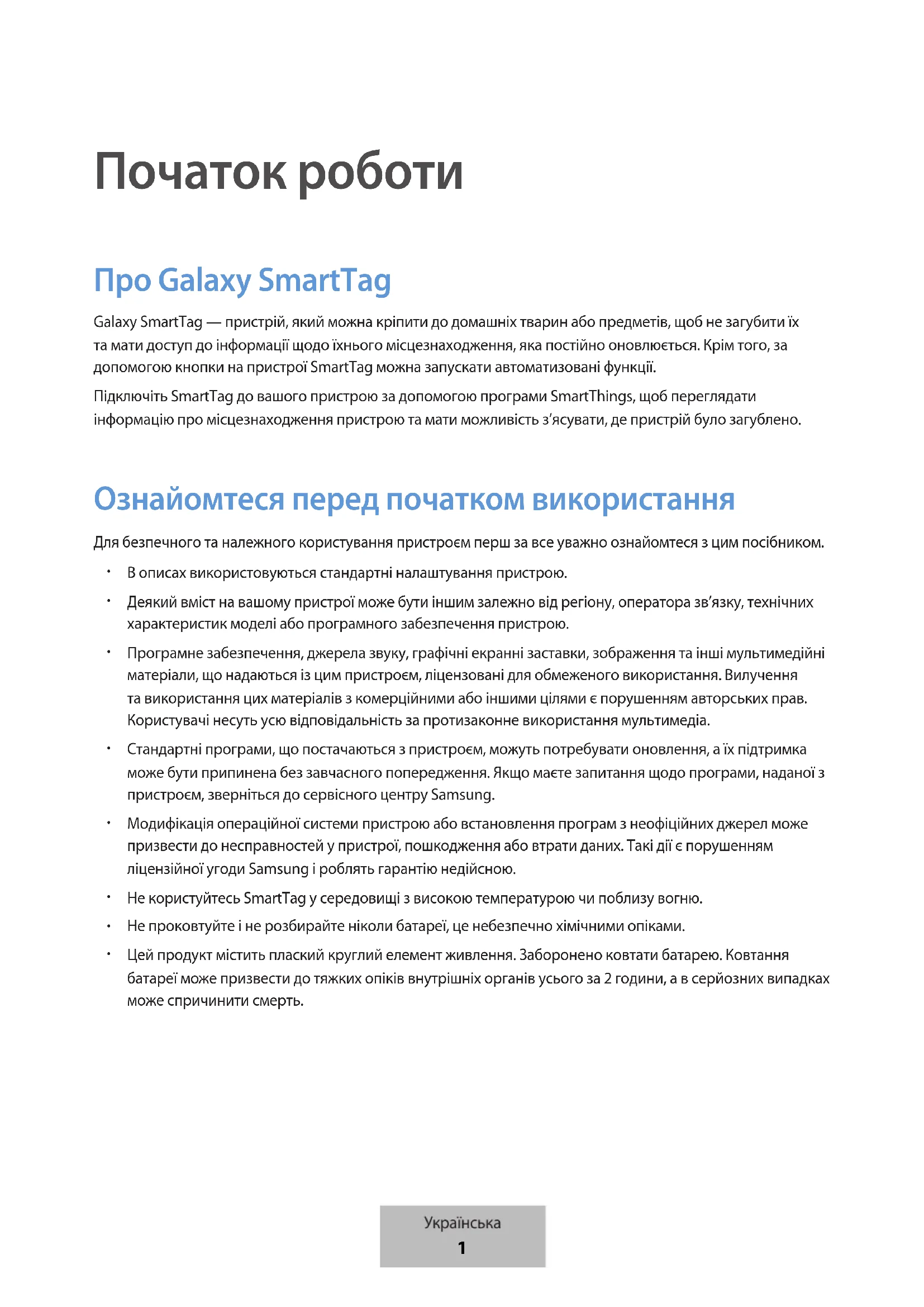 Початок роботи Про Galaxy SmartTag Galaxy SmartTag — пристрій, який можна кріпити до домашніх тварин або предметів, щоб не загубити їх та мати доступ до інформації щодо їхнього місцезнаходження, яка постійно оновлюється. Крім того, за допомогою кнопки на пристрої SmartTag можна запускати автоматизовані функції.Підключіть SmartTag до вашого пристрою за допомогою програми SmartThings, щоб переглядати інформацію про місцезнаходження пристрою та мати можливість з’ясувати, де пристрій було загублено. Ознайомтеся перед початком використання Для безпечного та належного користування пристроєм перш за все уважно ознайомтеся з цим посібником. В описах використовуються стандартні налаштування пристрою. Деякий вміст на вашому пристрої може бути іншим залежно від регіону, оператора зв’язку, технічних характеристик моделі або програмного забезпечення пристрою. Програмне забезпечення, джерела звуку, графічні екранні заставки, зображення та інші мультимедійні матеріали, що надаються із цим пристроєм, ліцензовані для обмеженого використання. Вилучення та використання цих матеріалів з комерційними або іншими цілями є порушенням авторських прав. Користувачі несуть усю відповідальність за протизаконне використання мультимедіа. Стандартні програми, що постачаються з пристроєм, можуть потребувати оновлення, а їх підтримка може бути припинена без завчасного попередження. Якщо маєте запитання щодо програми, наданої з пристроєм, зверніться до сервісного центру Samsung. Модифікація операційної системи пристрою або встановлення програм з неофіційних джерел може призвести до несправностей у пристрої, пошкодження або втрати даних. Такі дії є порушенням ліцензійної угоди Samsung і роблять гарантію недійсною. Не користуйтесь SmartTag у середовищі з високою температурою чи поблизу вогню. Не проковтуйте і не розбирайте ніколи батареї, це небезпечно хімічними опіками. Цей продукт містить плаский круглий елемент живлення. Заборонено ковтати батарею. Ковтання батареї може призвести до тяжких опіків внутрішніх органів усього за 2години, а в серйозних випадках може спричинити смерть.