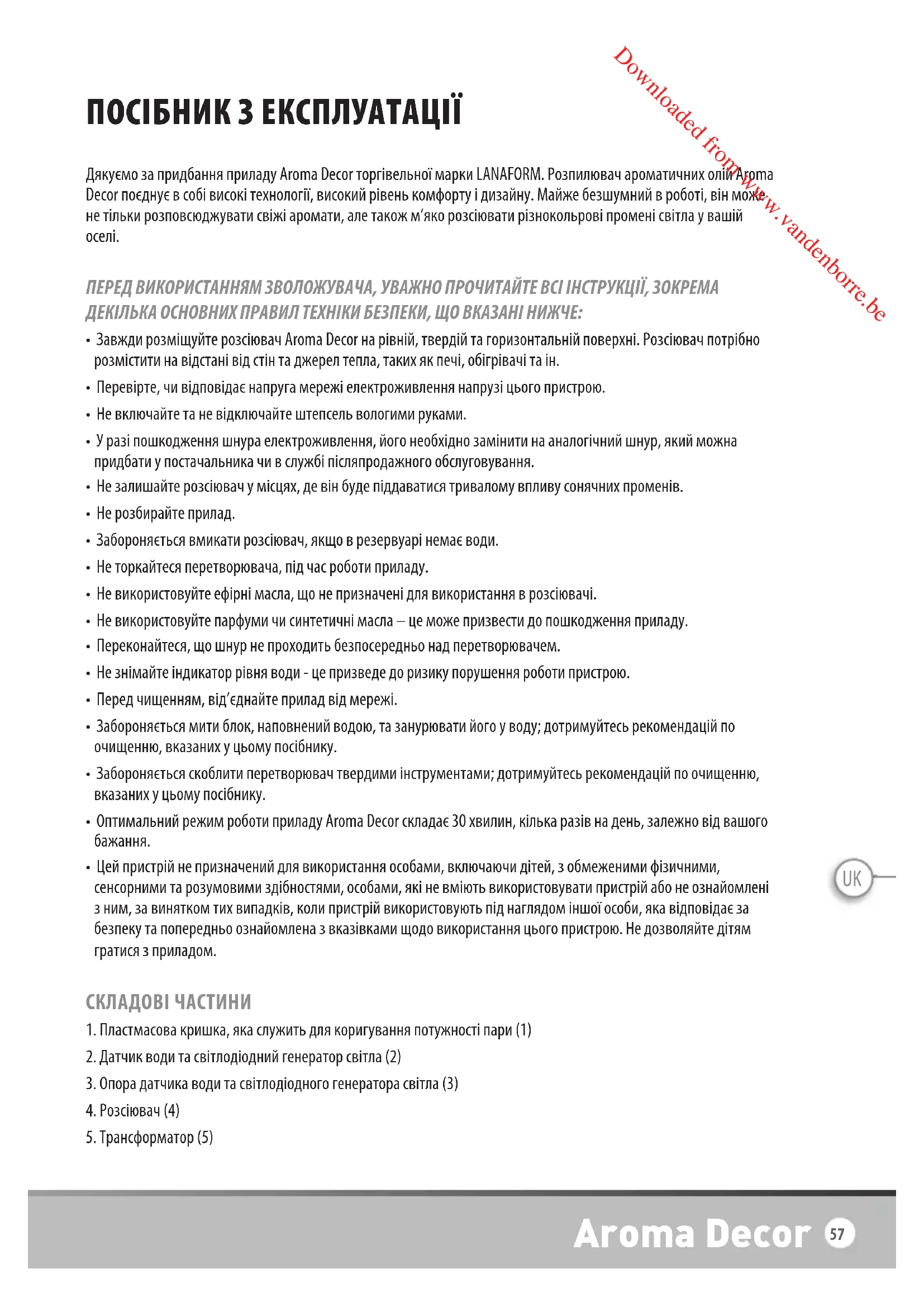 Downloaded from www.vandenborre.beUK ПОСІБНИК З ЕКСПЛУАТАЦІЇ Дякуємо за придбання приладу Aroma Decor торгівельної марки LANAFORM. Розпилювач ароматичних олій Aroma Decor поєднує в собі високі технології, високий рівень комфорту і дизайну. Майже безшумний в роботі, він може не тільки розповсюджувати свіжі аромати, але також м’яко розсіювати різнокольрові промені світла у вашій оселі. ПЕРЕД ВИКОРИСТАННЯМ ЗВОЛОЖУВАЧА, УВАЖНО ПРОЧИТАЙТЕ ВСІ ІНСТРУКЦІЇ, ЗОКРЕМА ДЕКІЛЬКА ОСНОВНИХ ПРАВИЛ ТЕХНІКИ БЕЗПЕКИ, ЩО ВКАЗАНІ НИЖЧЕ: