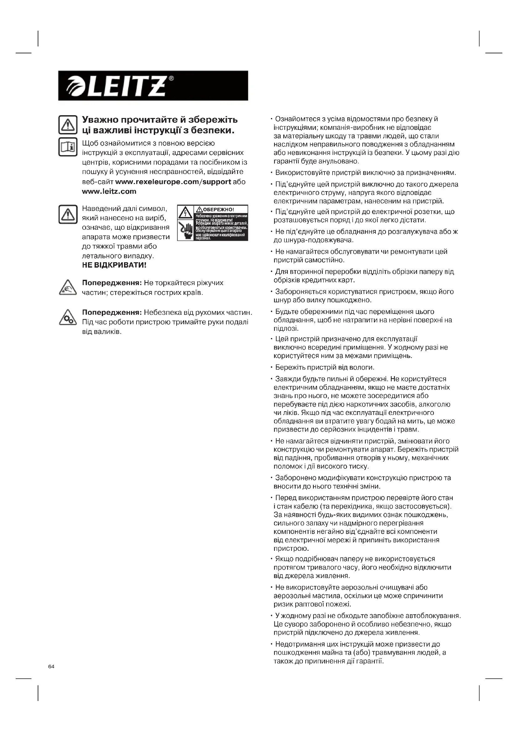 - Недотримання цих інструкцій може призвести до пошкодження майна та (або) травмування людей, а також до припинення дії гарантії. Уважно прочитайте й збережіть ці важливі інструкції з безпеки. Щоб ознайомитися з повною версією інструкцій з експлуатації, адресами сервісних центрів, корисними порадами та посібником із пошуку й усунення несправностей, відвідайте веб-сайт www.rexeleurope.com/support або www.leitz.com Попередження: Не торкайтеся ріжучих частин; стережіться гострих країв. Попередження: Небезпека від рухомих частин. Під час роботи пристрою тримайте руки подалі від валиків.656565 Уникайте потрапляння ювелірних виробів до