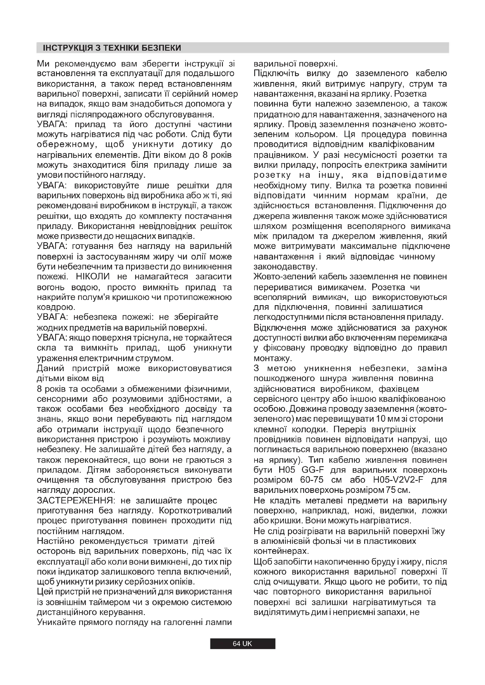 УВАГА: якщо поверхня тріснула, не торкайтеся скла та вимкніть прилад, щоб уникнути ураження електричним струмом. 8 років та особами з обмеженими фізичними, сенсорними або розумовими здібностями, а також особами без необхідного досвіду та знань, якщо вони перебувають під наглядом або отримали інструкції щодо безпечного використання пристрою і розуміють можливу небезпеку. Не залишайте дітей без нагляду, а також переконайтеся, що вони не граються з приладом. Дітям забороняється виконувати очищення та обслуговування пристрою без нагляду дорослих. Настійно рекомендується тримати дітей осторонь від варильних поверхонь, під час їх експлуатації або коли вони вимкнені, до тих пір поки індикатор залишкового тепла включений, щоб уникнути ризику серйозних опіків. Уникайте прямого погляду на галогенні лампи Цей пристрій не призначений для використання із зовнішнім таймером чи з окремою системою дистанційного керування. Підключіть вилку до заземленого кабелю живлення, який витримує напругу, струм та навантаження, вказані на ярлику. Розетка повинна бути належно заземленою, а також придатною для навантаження, зазначеного на ярлику. Провід заземлення позначено жовто- зеленим кольором. Ця процедура повинна проводитися відповідним кваліфікованим працівником. У разі несумісності розетки та вилки приладу, попросіть електрика замінити розетку на іншу, яка відповідатиме необхідному типу. Вилка та розетка повинні відповідати чинним нормам країни, де здійснюється встановлення. Підключення до джерела живлення також може здійснюватися шляхом розміщення всеполярного вимикача між приладом та джерелом живлення, який може витримувати максимальне підключене навантаження і який відповідає чинному законодавству. Жовто-зелений кабель заземлення не повинен перериватися вимикачем. Розетка чи всеполярний вимикач, що використовуються для підключення, повинні залишатися легкодоступними після встановлення приладу. З метою уникнення небезпеки, заміна пошкодженого шнура живлення повинна здійснюватися виробником, фахівцем сервісного центру або іншою кваліфікованою особою. Довжина проводу заземлення (жовто- зеленого) має перевищувати 10 мм зі сторони варильної поверхні. Відключення може здійснюватися за рахунок доступності вилки або включенням перемикача у фіксовану проводку відповідно до правил