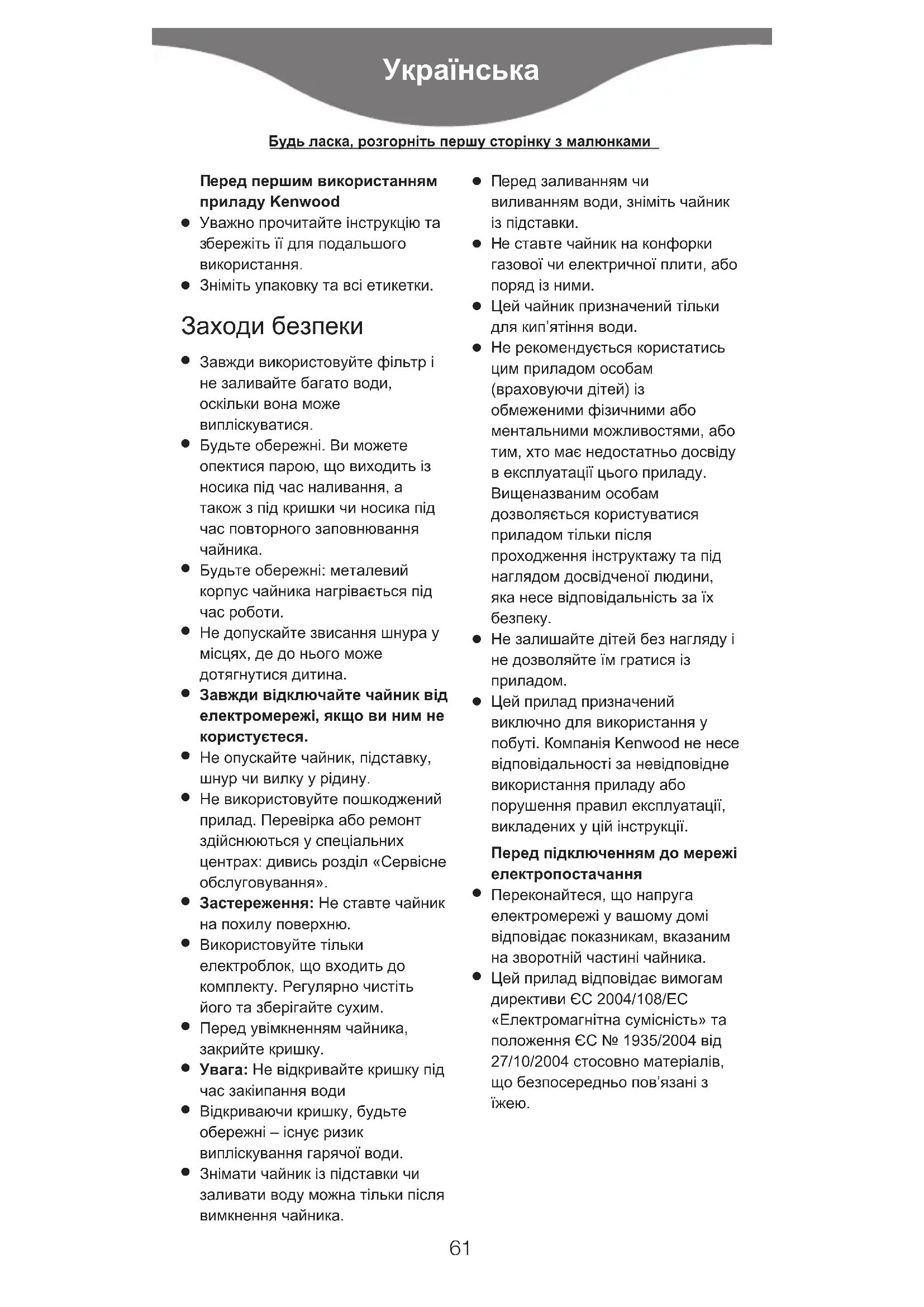 Цей прилад призначений виключно для використання у побуті. Компанія Kenwood не несе відповідальності за невідповідне використання приладу або порушення правил експлуатації, викладених у цій інструкції. Перед підключенням до мережі електропостачання