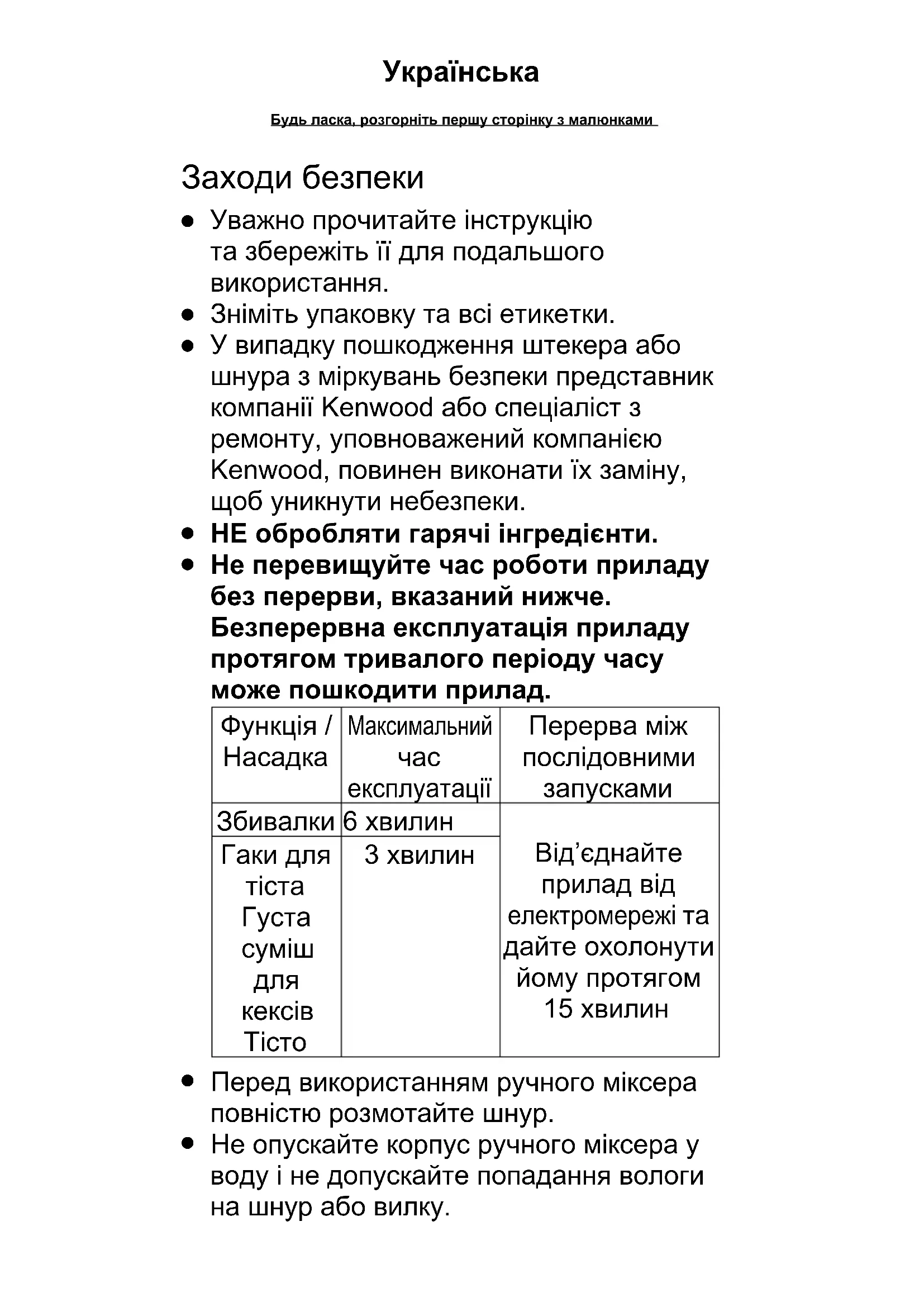 Не опускайте корпус ручного міксера у воду і не допускайте попадання вологи на шнур або вилку. Будь ласка, розгорніть першу сторінку з малюнками Українська135 136