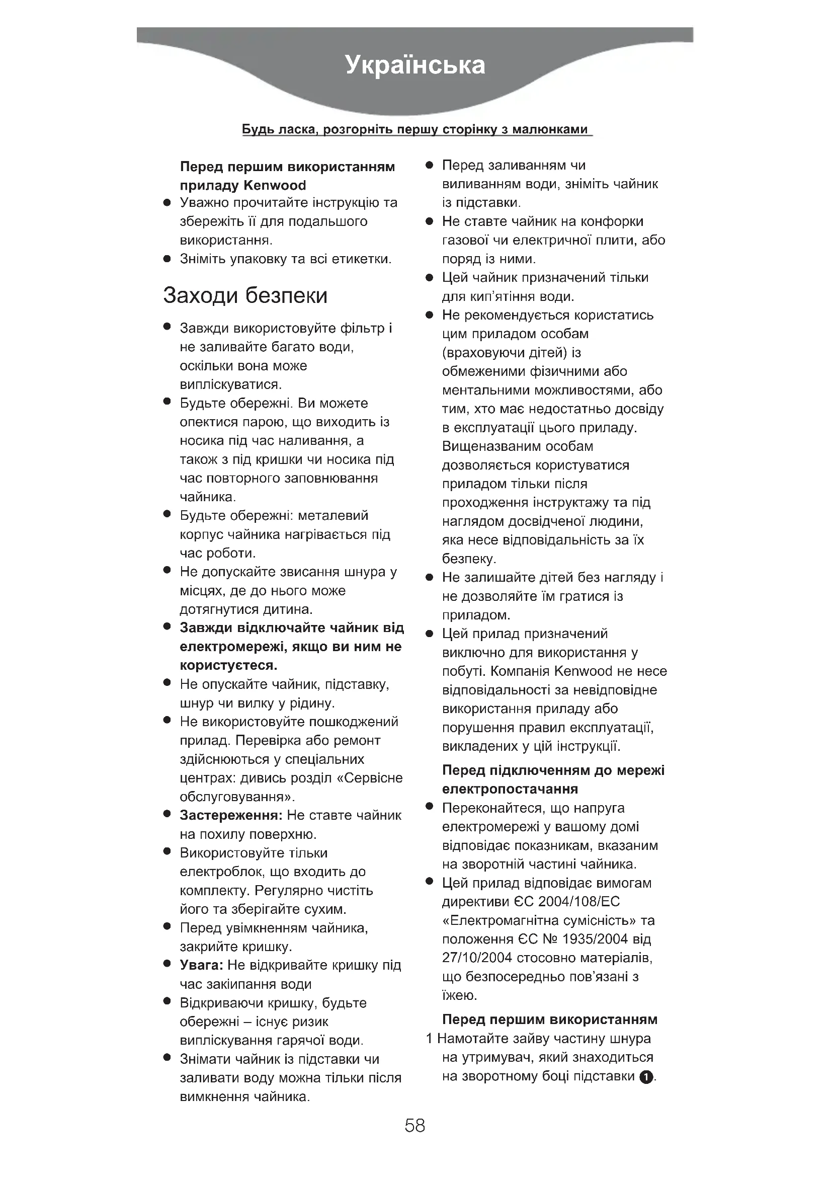 Будь ласка, розгорніть першу сторінку з малюнками2 Наповніть чайник до позначки ‘MAX’ (максимум), закип’ятіть, а потім вилийте воду. Повторіть цю процедуру 2-3 рази.