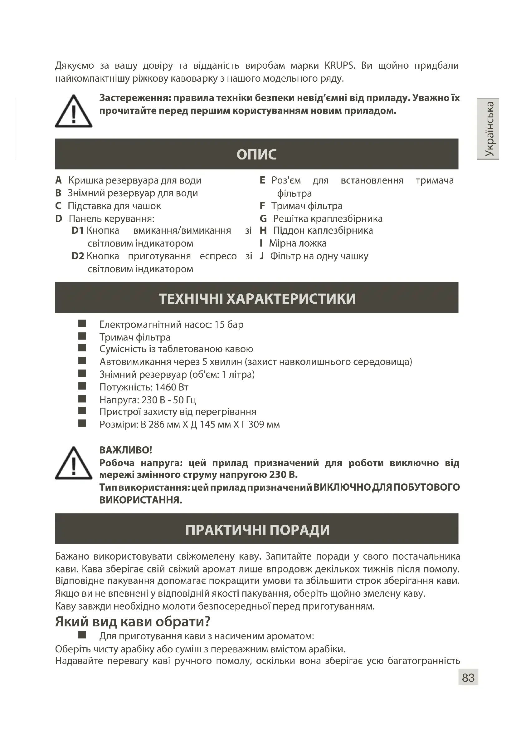 Робоча напруга: цей прилад призначений для роботи виключно від мережі змінного струму напругою 230 В. Тип використання: цей прилад призначений ВИКЛЮЧНО ДЛЯ ПОБУТОВОГО ВИКОРИСТАННЯ. Дякуємо за вашу довіру та відданість виробам марки KRUPS. Ви щойно придбали найкомпактнішу ріжкову кавоварку з нашого модельного ряду.