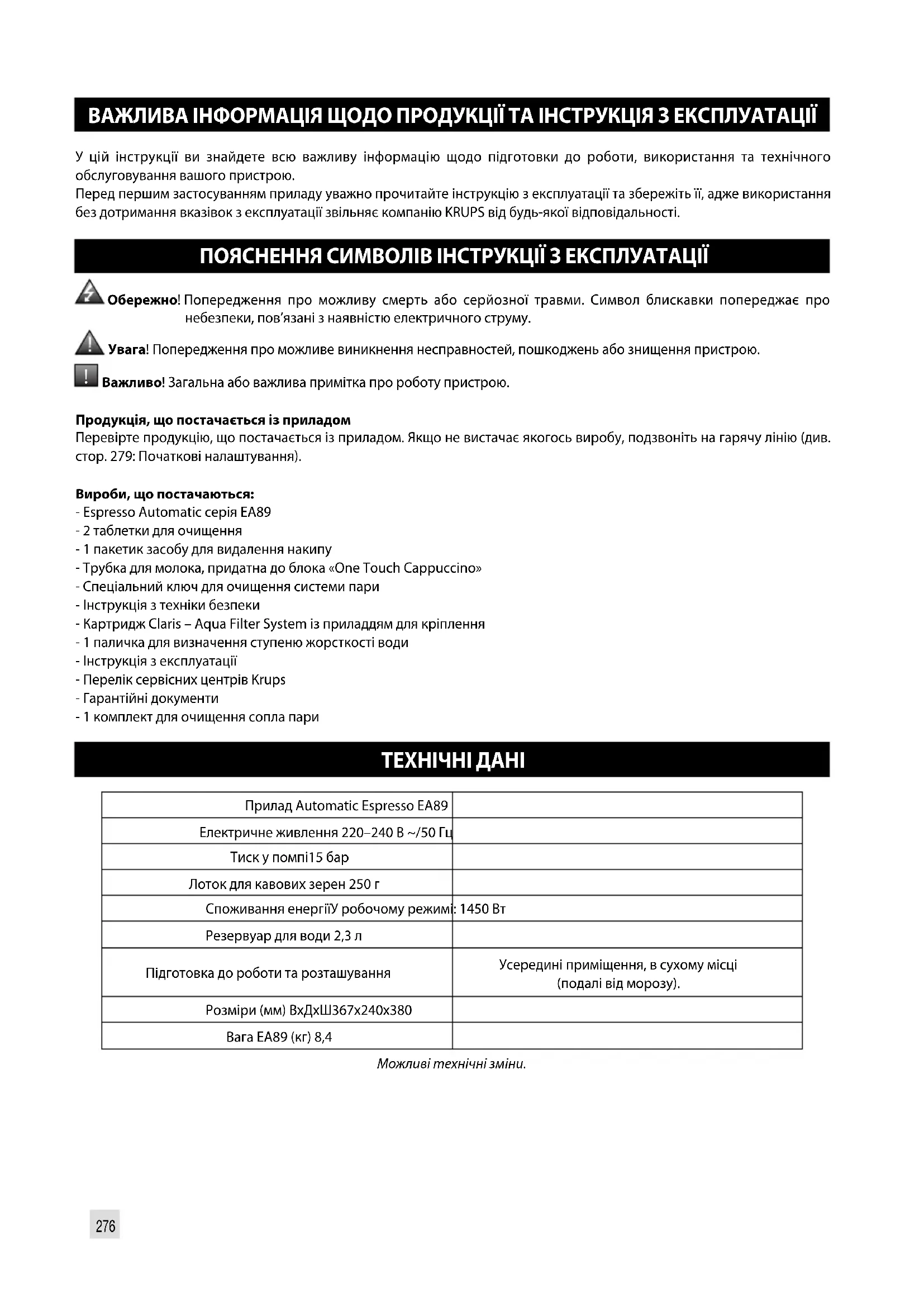 ВАЖЛИВА ІНФОРМАЦІЯ ЩОДО ПРОДУКЦІЇ ТА ІНСТРУКЦІЯ З ЕКСПЛУАТАЦІЇ ..................p. 276 ТЕХНІЧНІ ДАНІ ................................................................................................p. 276 ОПИС ПРИЛАДУ ..............................................................................................p. 277 ОГЛЯД ...........................................................................................................p. 277 ДОДАТОК KRUPS ............................................................................................. p. 278 ПІДГОТОВКА ДО РОБОТИ ВСТАНОВЛЕННЯ ПРИЛАДУ ................................................................................ p. 279 ПЕРЕД ПРИГОТУВАННЯМ НАПОЇВ ВАЖЛИВІ РЕКОМЕНДАЦІЇ ..................................................................................p. 280 ПРИГОТУВАННЯ КАВОВИХ НАПОЇВ ОДНИМ ДОТИКОМ ............................................ p. 281 ПРИГОТУВАННЯ НАПОЇВ ІЗ МОЛОКОМ ОДНИМ ДОТИКОМ .......................................p. 281 ПРИГОТУВАННЯ ЧАЮ ....................................................................................... p. 282 ПРИГОТУВАННЯ ІНШИХ НАПОЇВ: РІСТРЕТО, ДОПІО, АМЕРИКАНО ЧИ МОЛОЧНА ПІНКА ...................................................................... p. 282 ІНШІ ФУНКЦІЇ .................................................................................................. p. 283 ЗАГАЛЬНЕ ОБСЛУГОВУВАННЯ ............................................................................ p. 284 ПРОБЛЕМИ ТА СПОСОБИ ВИРІШЕННЯ ..................................................................p. 286276 ВАЖЛИВА ІНФОРМАЦІЯ ЩОДО ПРОДУКЦІЇ ТА ІНСТРУКЦІЯ З ЕКСПЛУАТАЦІЇ У цій інструкції ви знайдете всю важливу інформацію щодо підготовки до роботи, використання та технічного обслуговування вашого пристрою. Перед першим застосуванням приладу уважно прочитайте інструкцію з експлуатації та збережіть її, адже використання без дотримання вказівок з експлуатації звільняє компанію KRUPS від будь-якої відповідальності. ПОЯСНЕННЯ СИМВОЛІВ ІНСТРУКЦІЇ З ЕКСПЛУАТАЦІЇ Обережно! Попередження про можливу смерть або серйозної травми. Символ блискавки попереджає про небезпеки, пов’язані з наявністю електричного струму. Увага! Попередження про можливе виникнення несправностей, пошкоджень або знищення пристрою.