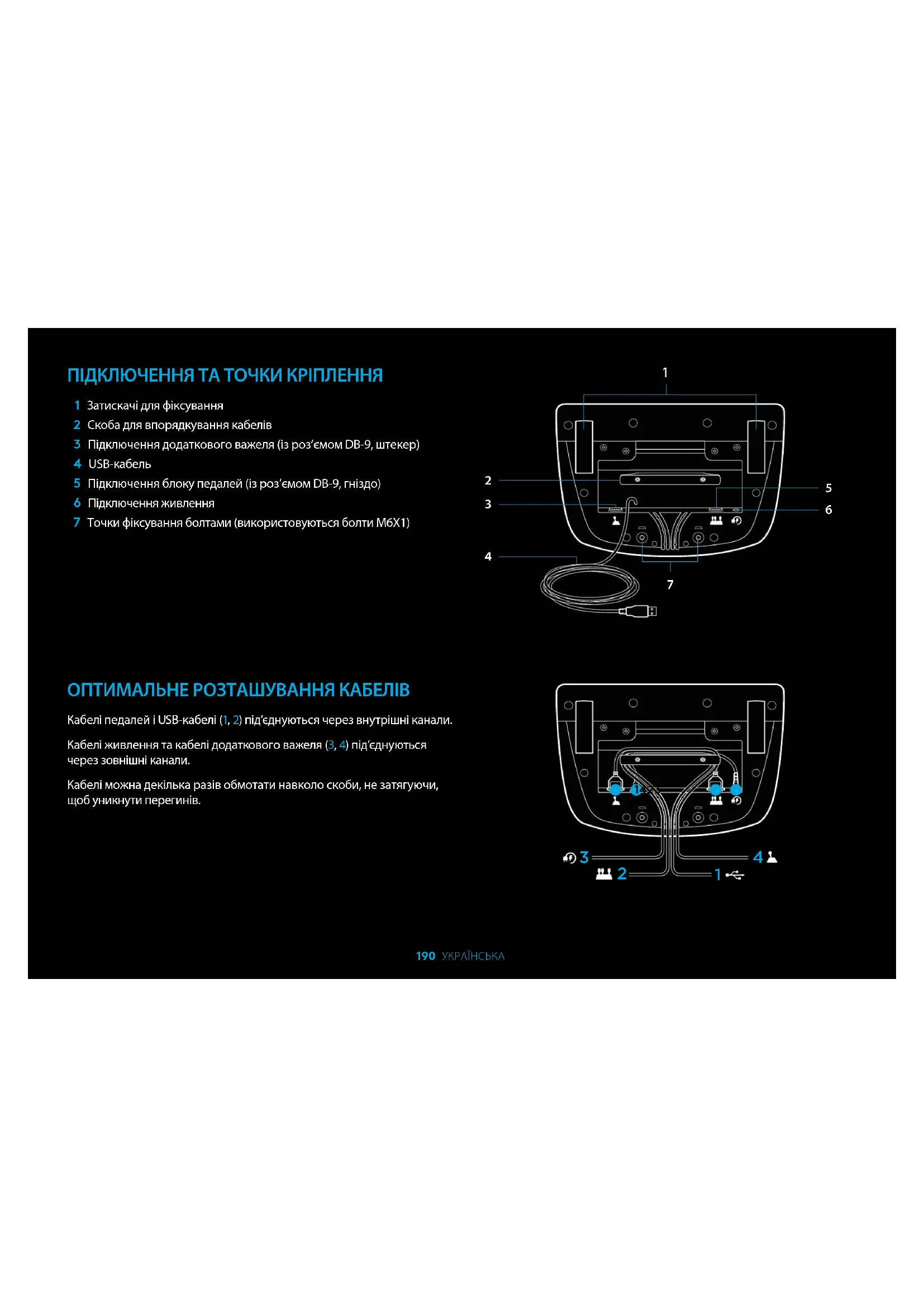 Na obrazovkách s volantom a pedálmi v G HUB si môžete skontrolovať každé tlačidlo a os zariadenia G923 na ubezpečenie, že všetko funguje správne. Pri volante si takisto môžete prezrieť vplyv zmeny prevádzkového rozsahu.190 УКРАЇНСЬКА ПІДКЛЮЧЕННЯ ТА ТОЧКИ КРІПЛЕННЯ 1 Затискачі для фіксування 2 Скоба для впорядкування кабелів 3 Підключення додаткового важеля (із роз’ємом DB-9, штекер) 4 USB-кабель 5 Підключення блоку педалей (із роз’ємом DB-9, гніздо) 6 Підключення живлення 7 Точки фіксування болтами (використовуються болти M6X1) ОПТИМАЛЬНЕ РОЗТАШУВАННЯ КАБЕЛІВ Кабелі педалей і USB-кабелі (1, 2) під’єднуються через внутрішніканали. Кабелі живлення та кабелі додаткового важеля (3, 4) під’єднуються через зовнішні канали. Кабелі можна декілька разів обмотати навколо скоби, не затягуючи, щоб уникнути перегинів.