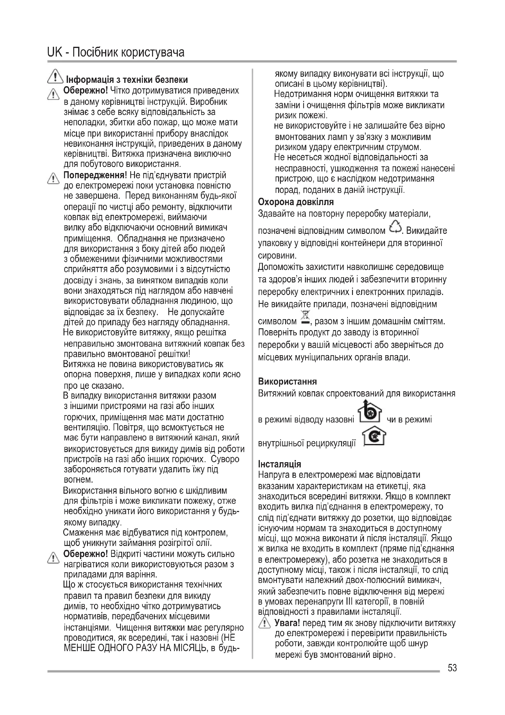 якому випадку виконувати всі інструкції, що описані в цьому керівництві). Недотримання норм очищення витяжки та заміни і очищення фільтрів може викликати ризик пожежі. не використовуйте і не залишайте без вірно вмонтованих ламп у зв’язку з можливим ризиком удару електричним струмом. Не несеться жодної відповідальності за несправності, ушкодження та пожежі нанесені пристрою, що є наслідком недотримання порад, поданих в даній інструкції. Oхоpoнa дoвкілля Здавайте на повторну переробку матеріали, позначені відповідним символом . Викидайте упаковку у відповідні контейнери для вторинної