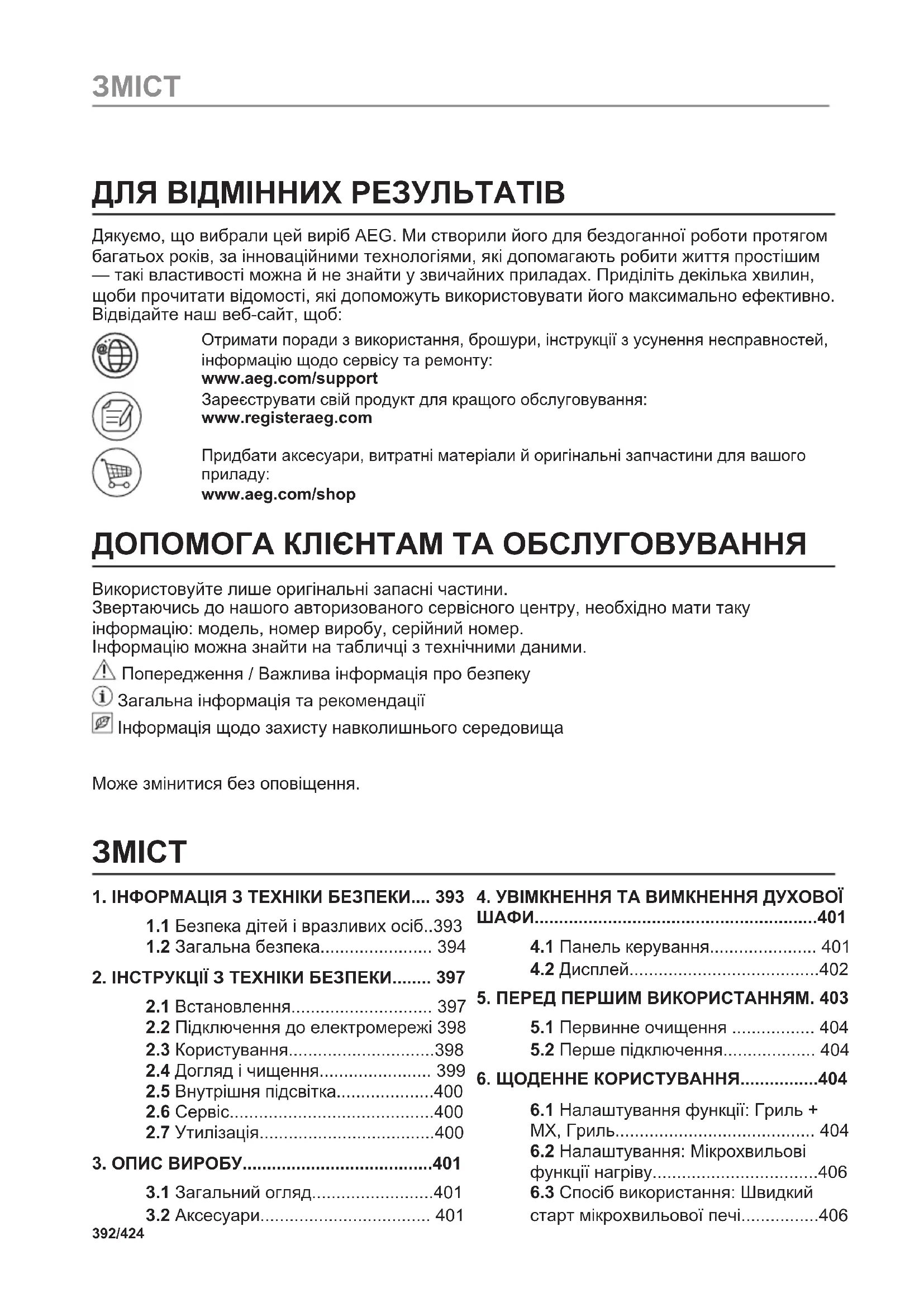 www.aeg.com/shop ДОПОМОГА КЛІЄНТАМ ТА ОБСЛУГОВУВАННЯ Використовуйте лише оригінальні запасні частини. Звертаючись до нашого авторизованого сервісного центру, необхідно мати таку інформацію: модель, номер виробу, серійний номер. Інформацію можна знайти на табличці з технічними даними. Попередження / Важлива інформація про безпеку Загальна інформація та рекомендації Інформація щодо захисту навколишнього середовища Може змінитися без оповіщення.