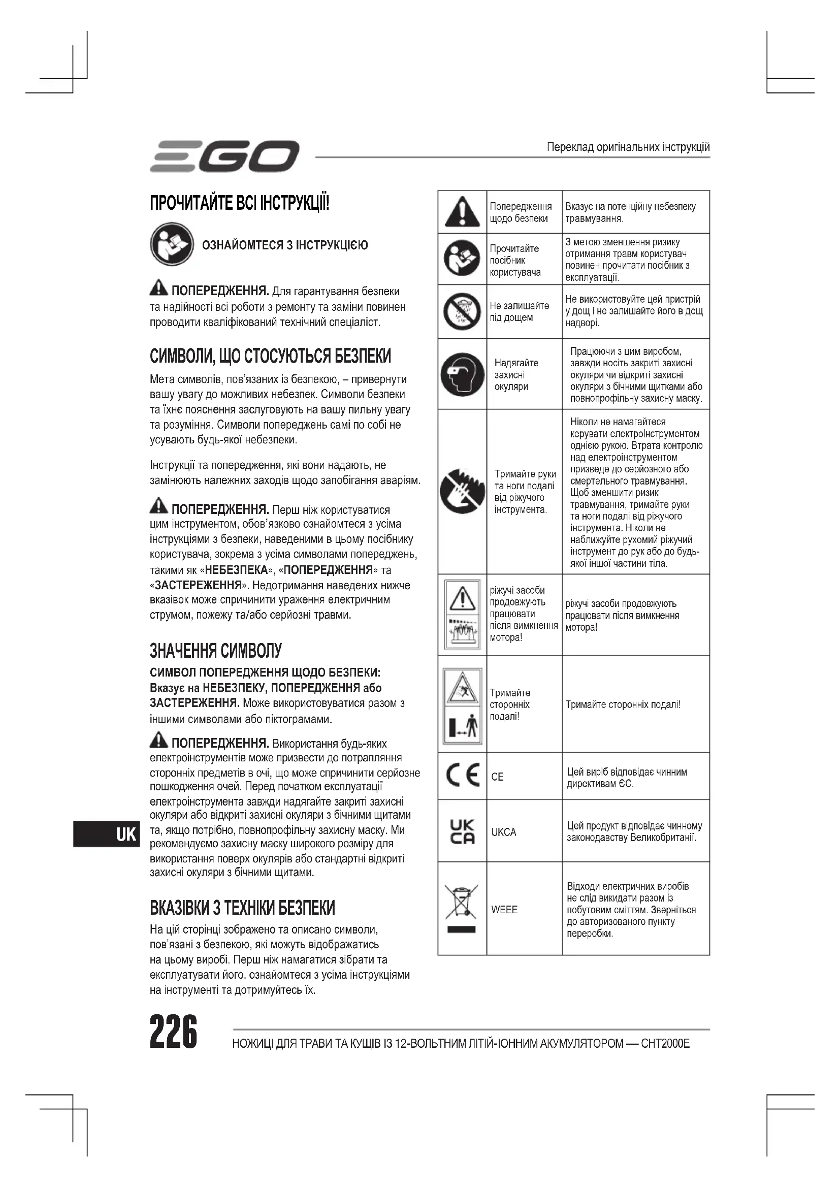 ПРОЧИТАЙТЕ ВСІ ІНСТРУКЦІЇ! ОЗНАЙОМТЕСЯ З ІНСТРУКЦІЄЮ ПОПЕРЕДЖЕННЯ. Для гарантування безпеки та надійності всі роботи з ремонту та заміни повинен проводити кваліфікований технічний спеціаліст. СИМВОЛИ, ЩО СТОСУЮТЬСЯ БЕЗПЕКИ Мета символів, пов’язаних із безпекою, – привернути вашу увагу до можливих небезпек. Символи безпеки та їхнє пояснення заслуговують на вашу пильну увагу та розуміння. Символи попереджень самі по собі не усувають будь-якої небезпеки. Інструкції та попередження, які вони надають, не замінюють належних заходів щодо запобігання аваріям. ПОПЕРЕДЖЕННЯ. Перш ніж користуватися цим інструментом, обов’язково ознайомтеся з усіма інструкціями з безпеки, наведеними в цьому посібнику користувача, зокрема з усіма символами попереджень, такими як «НЕБЕЗПЕКА», «ПОПЕРЕДЖЕННЯ» та «ЗАСТЕРЕЖЕННЯ». Недотримання наведених нижче вказівок може спричинити ураження електричним струмом, пожежу та/або серйозні травми. ЗНАЧЕННЯ СИМВОЛУ СИМВОЛ ПОПЕРЕДЖЕННЯ ЩОДО БЕЗПЕКИ: Вказує на НЕБЕЗПЕКУ, ПОПЕРЕДЖЕННЯ або ЗАСТЕРЕЖЕННЯ. Може використовуватися разом з іншими символами або піктограмами. ПОПЕРЕДЖЕННЯ. Використання будь-яких електроінструментів може призвести до потрапляння сторонніх предметів в очі, що може спричинити серйозне пошкодження очей. Перед початком експлуатації електроінструмента завжди надягайте закриті захисні окуляри або відкриті захисні окуляри з бічними щитами та, якщо потрібно, повнопрофільну захисну маску. Ми рекомендуємо захисну маску широкого розміру для використання поверх окулярів або стандартні відкриті захисні окуляри з бічними щитами. ВКАЗІВКИ З ТЕХНІКИ БЕЗПЕКИ На цій сторінці зображено та описано символи, пов’язані з безпекою, які можуть відображатись на цьому виробі. Перш ніж намагатися зібрати та експлуатувати його, ознайомтеся з усіма інструкціями на інструменті та дотримуйтесь їх. Попередження щодо безпекиВказує на потенційну небезпеку травмування.Прочитайте посібник користувачаЗ метою зменшення ризику отримання травм користувач повинен прочитати посібник з експлуатації.Не залишайте під дощемНе використовуйте цей пристрій у дощ і не залишайте його в дощ надворі.Надягайте захисні окуляриПрацюючи з цим виробом, завжди носіть закриті захисні окуляри чи відкриті захисні окуляри з бічними щитками або повнопрофільну захисну маску.Тримайте руки та ноги подалі від ріжучого інструмента.Ніколи не намагайтеся керувати електроінструментом однією рукою. Втрата контролю над електроінструментом призведе до серйозного або смертельного травмування. Щоб зменшити ризик травмування, тримайте руки та ноги подалі від ріжучого інструмента. Ніколи не наближуйте рухомий ріжучий інструмент до рук або до будь-якої іншої частини тіла.ріжучі засоби продовжують працювати після вимкнення мотора!ріжучі засоби продовжують працювати після вимкнення мотора!Тримайте сторонніх подалі!Тримайте сторонніх подалі! Цей виріб відповідає чинним директивам ЄС. UKCA Цей продукт відповідає чинному законодавству Великобританії. WEEE Відходи електричних виробів не слід викидати разом із побутовим сміттям. Зверніться до авторизованого пункту переробки. Переклад оригінальних інструкційНОЖИЦІ ДЛЯ ТРАВИ ТА КУЩІВ ІЗ 12-ВОЛЬТНИМ ЛІТІЙ-ІОННИМ АКУМУЛЯТОРОМ — CHT2000E 227