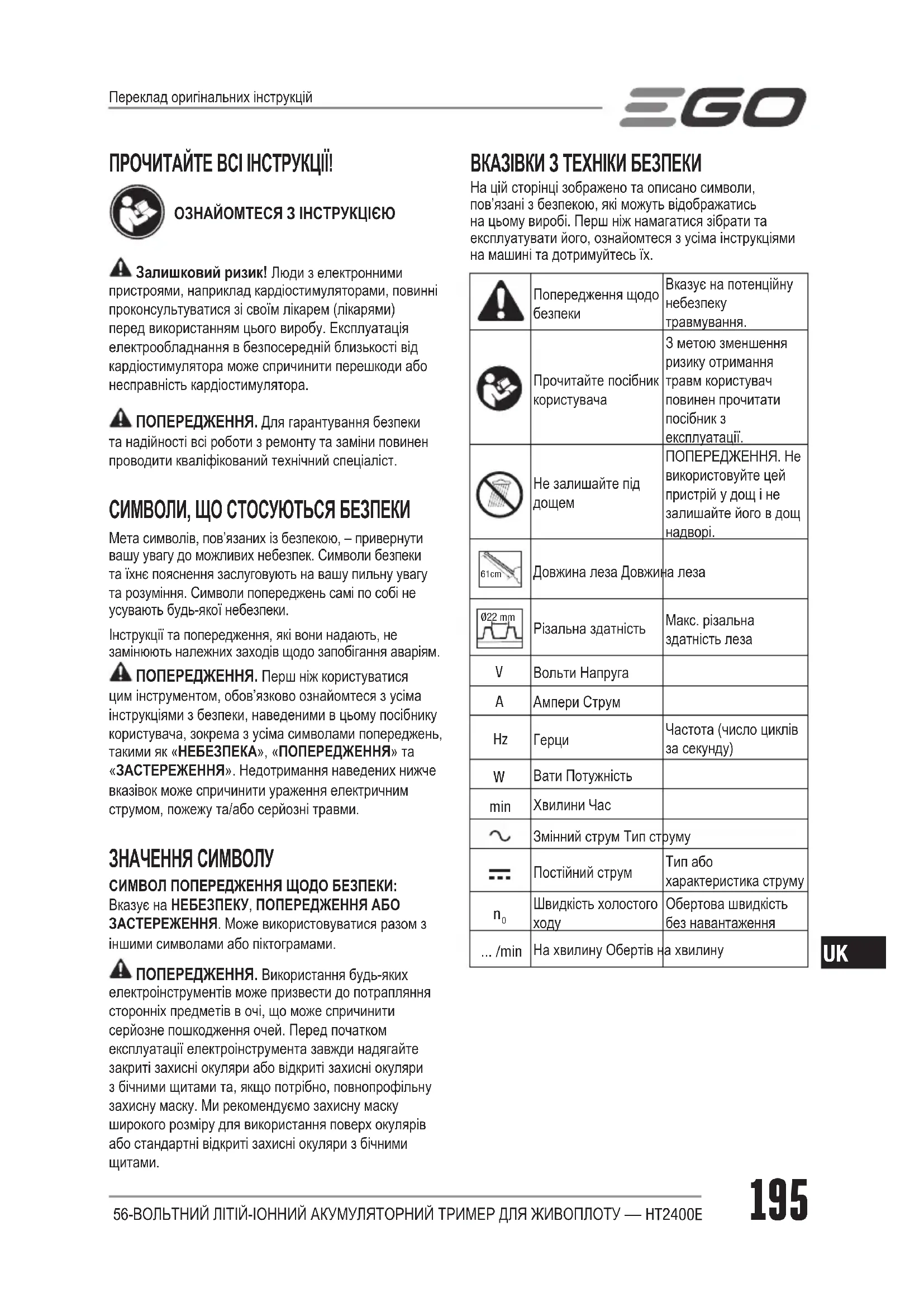 ПОПЕРЕДЖЕННЯ. Якщо лезо натрапляє на будь- який електричний шнур або лінію, НЕ ТОРКАЙТЕСЯ ЛЕЗА! ВОНО МОЖЕ БУТИ ПІД НАПРУГОЮ І ДУЖЕ НЕБЕЗПЕЧНИМ. Продовжуйте тримати тример для живоплоту за ізольовану задню ручку або відкладіть його в безпечний спосіб. Відключіть подачу електроенергії на пошкоджену лінію або шнур, перш ніж намагатися звільнити лезо від лінії або шнура. Нехтування цим попередженням призводить до тяжких травм або можливої смерті. ПОПЕРЕДЖЕННЯ. Щоб запобігти серйозній травмі, тримайте руки подалі від лез. Не намагайтеся видаляти зрізані матеріали або тримати матеріал, який слід зрізати. під час руху леза. Переконайтеся, що леза повністю зупинилися, а акумуляторну батарею вийнято, перед усуненням матеріалу, що застряг у лезах. Не беріть руками відкриті леза або ріжучі кромки, коли піднімаєте або тримаєте прилад. ПОПЕРЕДЖЕННЯ. Очищуйте ділянку підрізання перед кожним використанням. Вилучіть усі предмети, такі як шнури, проводи, дроти або мотузки, які можуть заплутатись у ріжучому лезі та створити ризик серйозних травм.56-ВОЛЬТНИЙ ЛІТІЙ-ІОННИЙ АКУМУЛЯТОРНИЙ ТРИМЕР ДЛЯ ЖИВОПЛОТУ — HT2400E