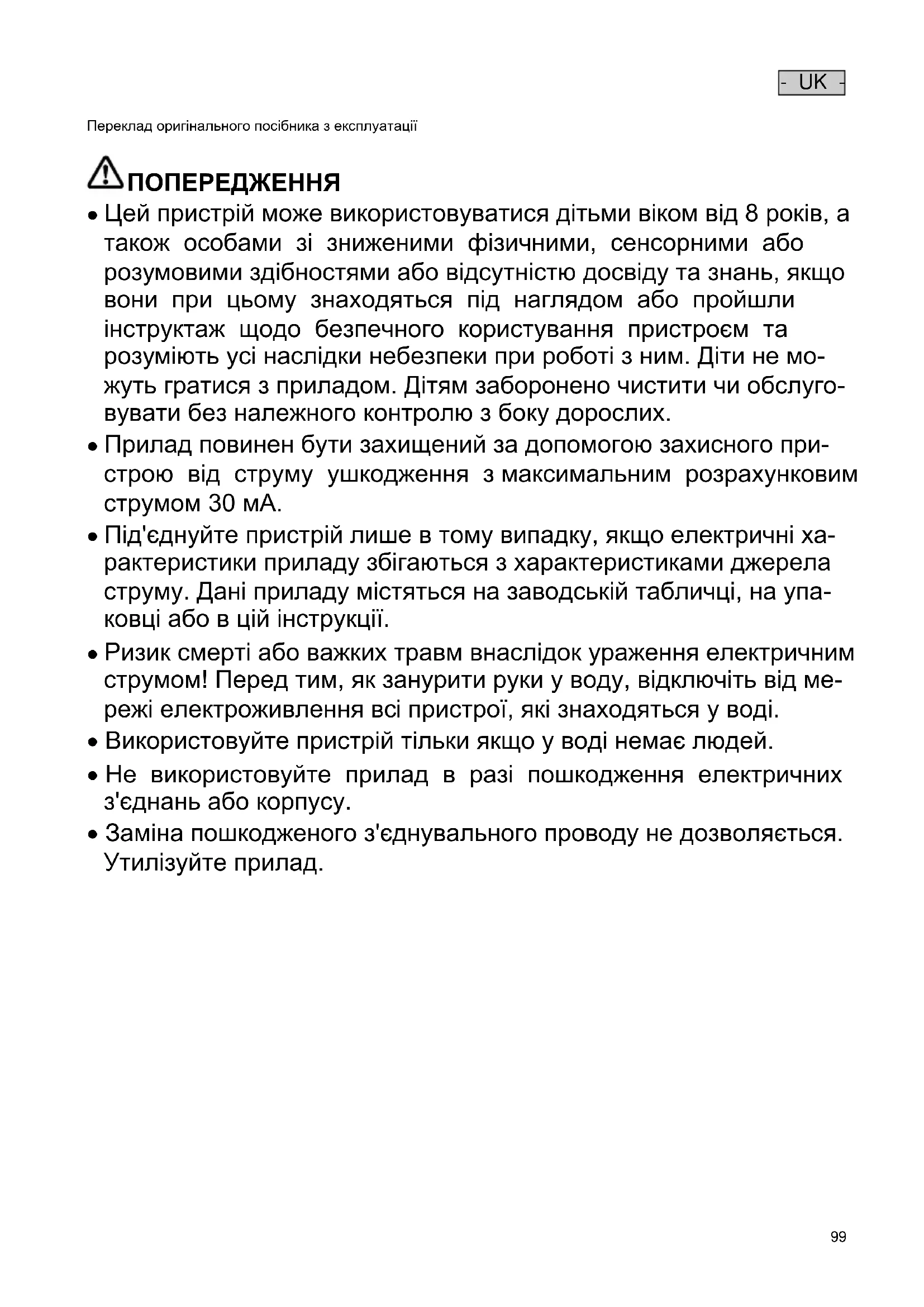 Ризик смерті або важких травм внаслідок ураження електричним струмом! Перед тим, як занурити руки у воду, відключіть від ме- режі електроживлення вс і пристрої, які знаходяться у воді. Використовуйте пристрій тільки якщо у воді немає людей. Не використовуйте прилад в разі пошкодження електричних з'єднань або корпусу. Заміна пошкодженого з'єднувального проводу не дозволяється. Утилізуйте прилад.- UK -
