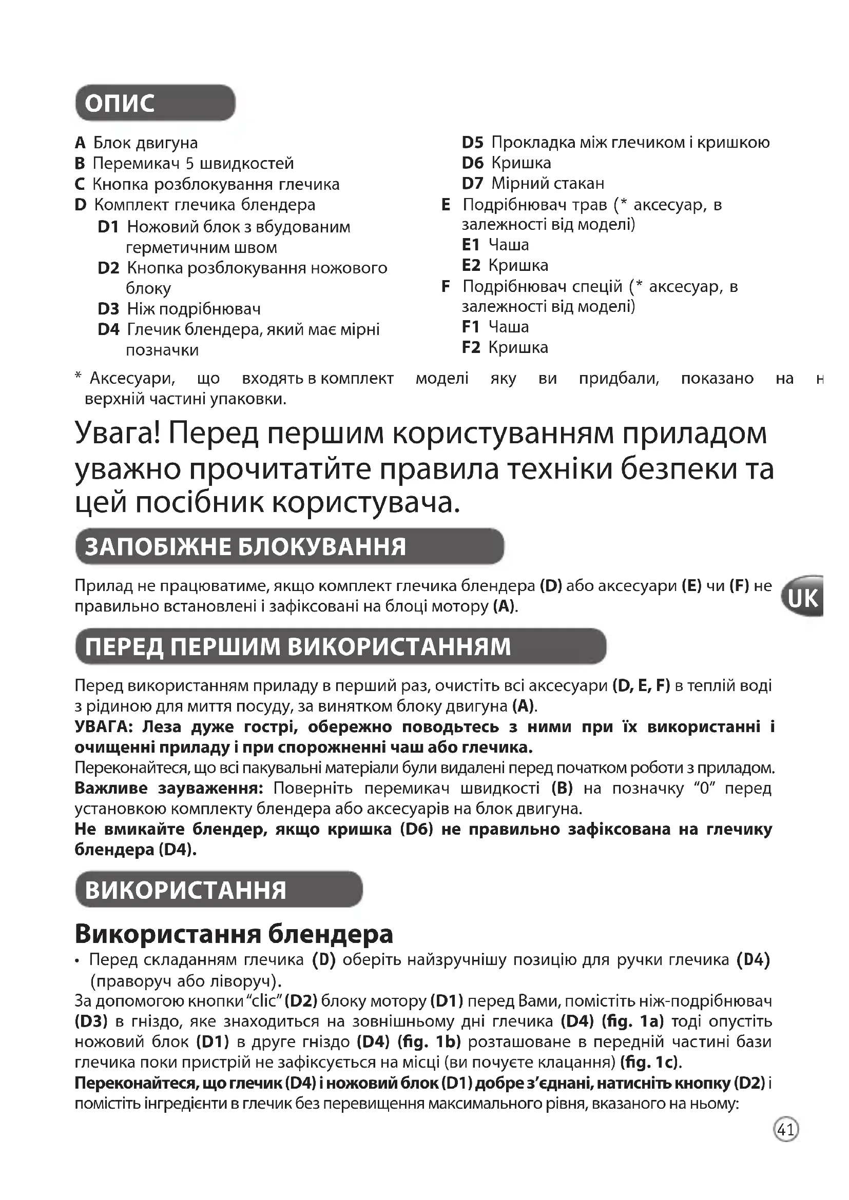 D5 Прокладкаміжглечикомікришкою D6 Кришка D7 Мірнийстакан E Подрібнювач трав (* аксесуар, в залежностівідмоделі) E1 Чаша E2 Кришка F Подрібнювач спецій (* аксесуар, в залежностівідмоделі) F1 Чаша F2 Кришка *Аксесуари, що входятьвкомплект моделі яку ви придбали, показано на наклейціна верхнійчастиніупаковки. Приладнепрацюватиме,якщокомплектглечикаблендера(D)абоаксесуари(E)чи(F)не правильновстановленіізафіксованінаблоцімотору(A). Увага!Передпершимкористуваннямприладом уважнопрочитатйтеправилатехнікибезпекита цейпосібниккористувача. Передвикористаннямприладувпершийраз,очистітьвсіаксесуари(D, E, F)втеплійводі зрідиноюдлямиттяпосуду,завиняткомблокудвигуна(A).