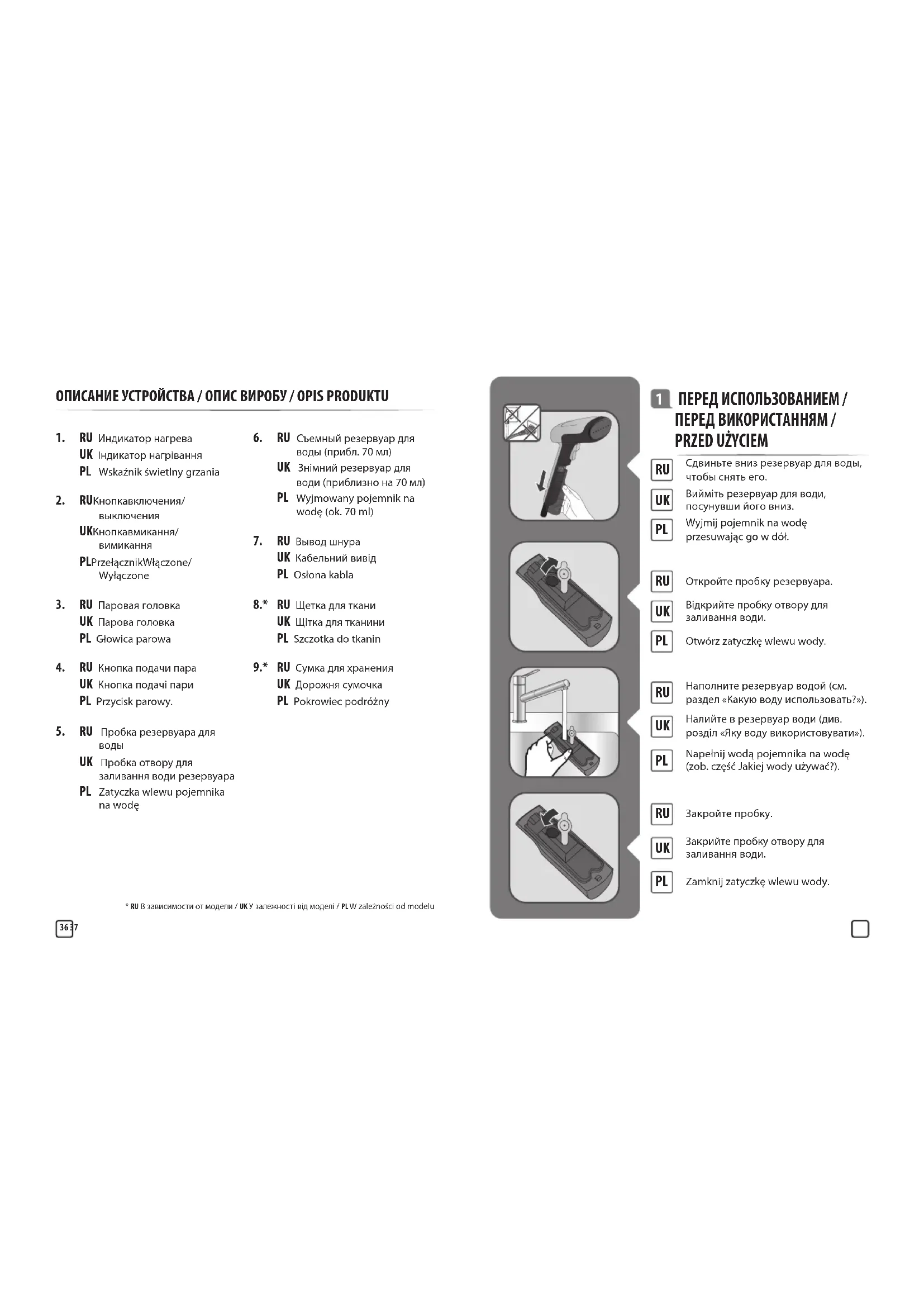 - RU В зависимости от модели / UK У залежності від моделі / PL W zależności od modelu ОПИСАНИЕ УСТРОЙСТВА / ОПИС ВИРОБУ / OPIS PRODUKTU