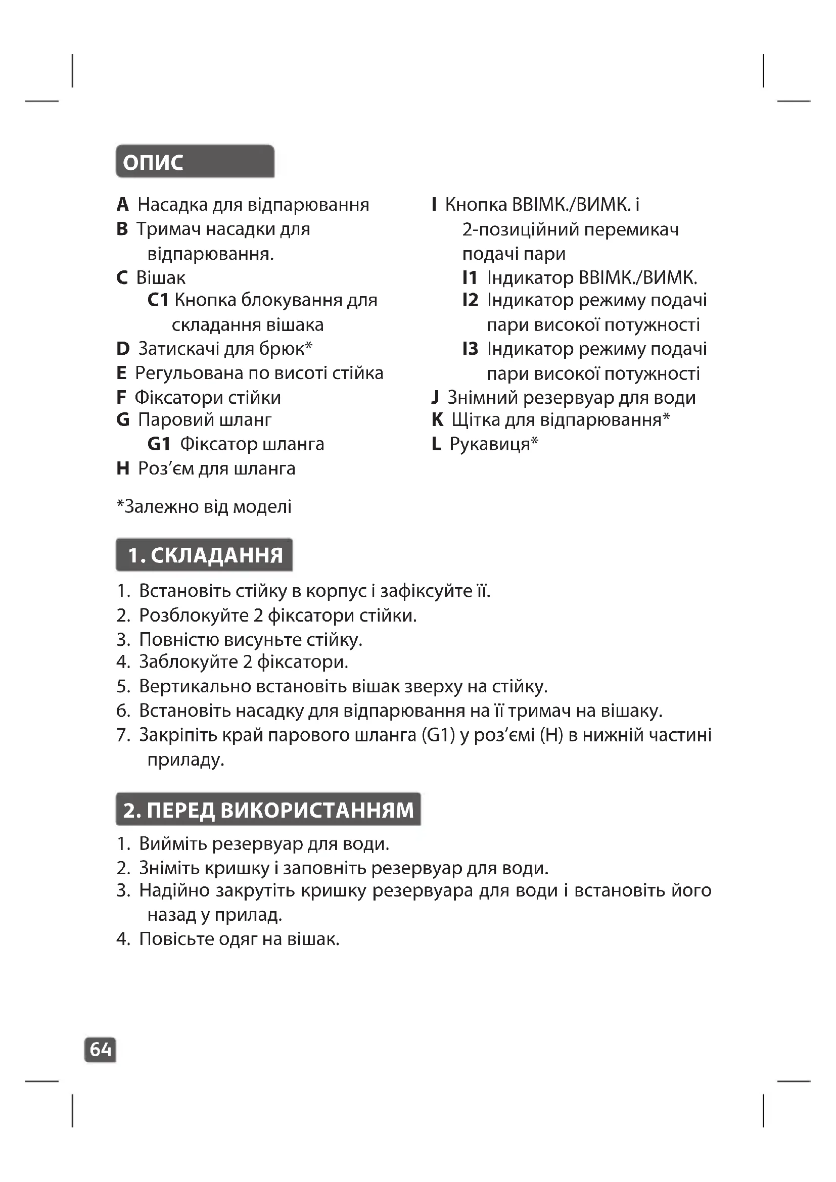 A Насадка для відпарювання B Тримач насадки для відпарювання. C Вішак C1 Кнопка блокування для складання вішака D Затискачі для брюк* E Регульована по висоті стійка F Фіксатори стійки G Паровий шланг G1 Фіксатор шланга H Роз’єм для шланга I Кнопка ВВІМК./ВИМК. і 2-позиційний перемикач подачі пари I1 Індикатор ВВІМК./ВИМК. I2 Індикатор режиму подачі пари високої потужності I3 Індикатор режиму подачі пари високої потужності J Знімний резервуар для води K Щітка для відпарювання* L Рукавиця*