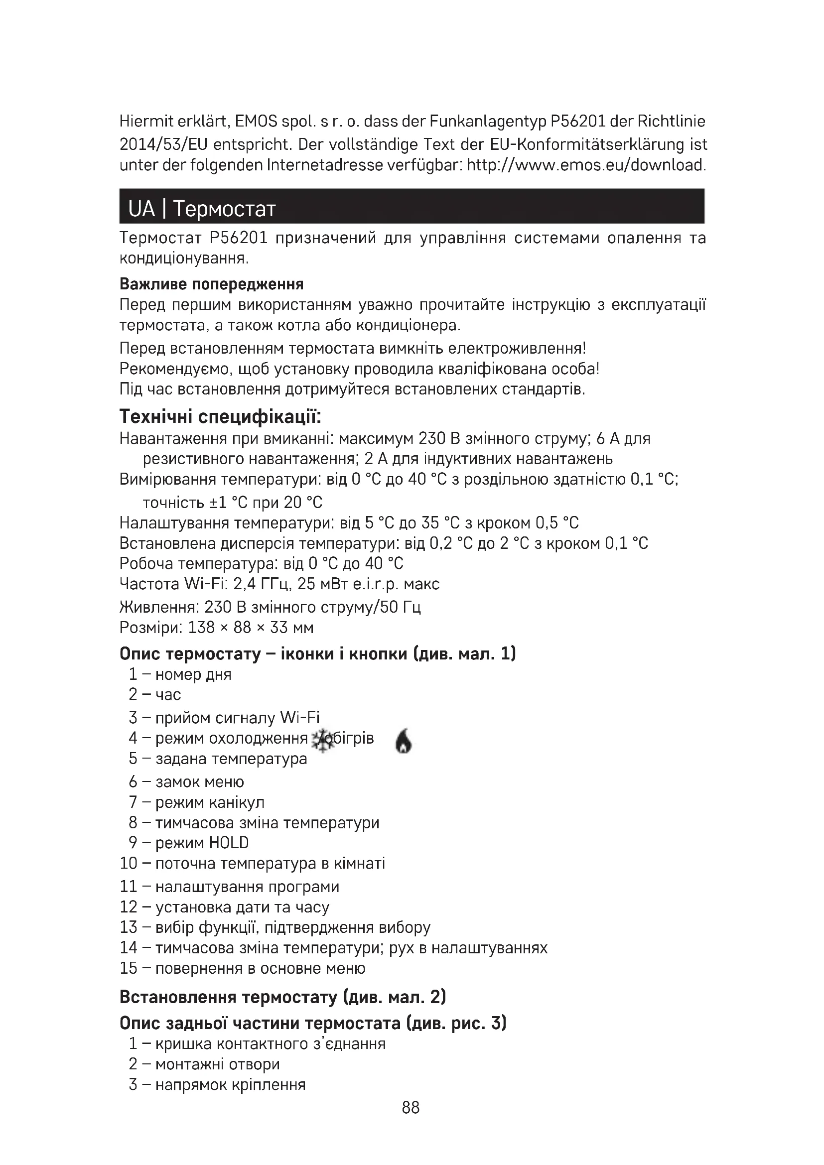 - Dieses Gerät ist nicht für die Verwendung durch Personen vorgesehen (Kin- der eingeschlossen), die verminderte körperliche, sensorielle oder geistige Fähigkeiten haben oder nicht über ausreichende Erfahrung und Kenntnisse verfügen, außer sie haben von einer Person, die für ihre Sicherheit verant- wortlich ist, Anweisungen für den Gebrauch des Geräts erhalten oder werden von dieser beaufsichtigt. Kinder müssen beaufsichtigt werden, um sicher zu gehen, dass sie nicht mit dem Gerät spielen. HINWEIS: Der Inhalt dieser Anleitung darf ohne vorherigen Hinweis geändert werden – aufgrund der eingeschränkten Druckmöglichkeiten können die Symbole unmerklich von den Displaydarstellungen abweichen – der Inhalt dieser Anleitung darf ohne Genehmigung des Herstellers nicht reproduziert werden. Die Elektroverbraucher nicht als unsortierter Kommunalabfall entsorgen, Sammelstellen für sortierten Abfall bzw. Müll benutzen. Setzen Sie sich wegen aktuellen Informationen über die jeweiligen Sammelstellen mit örtlichen Behörden in Verbindung. Wenn Elektroverbraucher auf üblichen Mülldeponien gelagert werden, können Gefahrstoe ins Grundwasser einsickern und in den Lebensmittelumlauf gelangen, Ihre Gesundheit beschädigen und Ihre Gemütlichkeit verderben.88 Hiermit erklärt, EMOS spol. s r. o. dass der Funkanlagentyp P56201 der Richtlinie 2014/53/EU entspricht. Der vollständige Text der EU-Konformitätserklärung ist unter der folgenden Internetadresse verfügbar: http://www.emos.eu/download. UA | Термостат Термостат P56201 призначений для управління системами опалення та кондиціонування. Важливе попередження Перед першим використанням уважно прочитайте інструкцію з експлуатації термостата, а також котла або кондиціонера. Перед встановленням термостата вимкніть електроживлення! Рекомендуємо, щоб установку проводила кваліфікована особа! Під час встановлення дотримуйтеся встановлених стандартів. Технічні специфікації: Навантаження при вмиканні: максимум 230 В змінного струму; 6 А для резистивного навантаження; 2 А для індуктивних навантажень Вимірювання температури: від 0 °C до 40 °C з роздільною здатністю 0,1 °C; точність ±1 °C при 20 °C Налаштування температури: від 5 °C до 35 °C з кроком 0,5 °C Встановлена дисперсія температури: від 0,2 °C до 2 °C з кроком 0,1 °C Робоча температура: від 0 °C до 40 °C Частота Wi-Fi: 2,4 ГГц, 25 мВт e.i.r.p. макс Живлення: 230 В змінного струму/50 Гц Розміри: 138 × 88 × 33 мм Опис термостату – іконки і кнопки (див. мал. 1) 1 – номер дня 2 – час 3 – прийом сигналу Wi-Fi 4 – режим охолодження /обігрів 5 – задана температура 6 – замок меню 7 – режим канікул 8 – тимчасова зміна температури 9 – режим HOLD 10 – поточна температура в кімнаті 11 – налаштування програми 12 – установка дати та часу 13 – вибір функції, підтвердження вибору 14 – тимчасова зміна температури; рух в налаштуваннях 15 – повернення в основне меню Встановлення термостату (див. мал. 2) Опис задньої частини термостата (див. рис. 3) 1 – кришка контактного з’єднання 2 – монтажні отвори 3 – напрямок кріплення89 Мобільна програма Термостатом можна керувати за допомогою мобільної програми для iOS або Android. Завантажте програму «EMOS GoSmart» для свого пристрою. QR-код для завантаження програми Android QR-код для завантаження програми iOS Опис реєстрації та входу в програму (див. мал. 4) Для використання мобільної програми необхідно спочатку зареєструватися, натиснувши кнопку Зареєструватись. Введіть країну та адресу електронної пошти, перекресліть прийняття згоди користувача та натисніть Отримати код підтвердження. Введіть код підтвердження, надісланий на вашу електронну адресу. Потім встановіть пароль для свого облікового запису та натисніть Готово. По своєму міркуванню перекресліть вибір Аналіз даних/Персоналізація і клікніть Перейти до програми. Сполучення термостату до мережі Wi-Fi для управління через мобільну програму (див. мал. 5) Натисніть та притримайте кнопку протягом 5 секунд. Потім натисніть кнопку протягом 3 секунд. Буде зображено E2 тa мигатиме іконка . У програмі кл