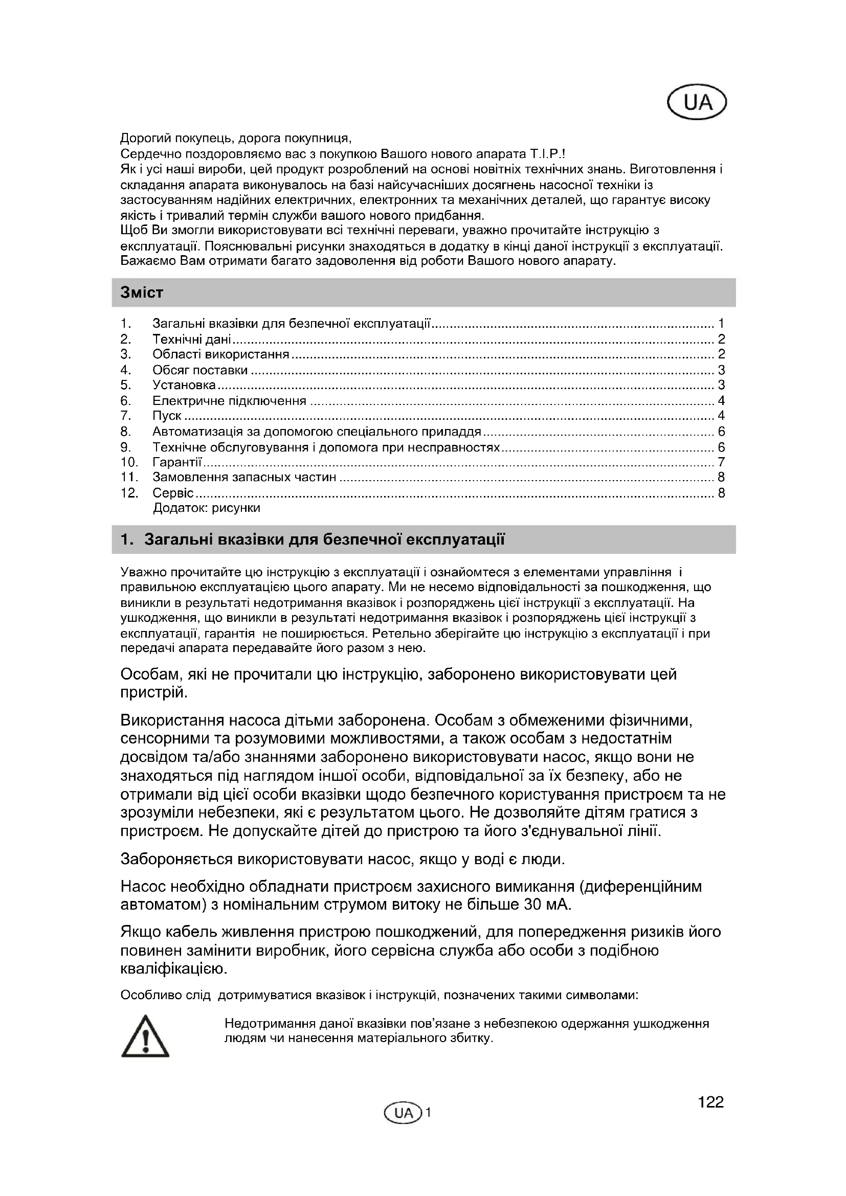 Дорогий покупець, дорога покупниця, Сердечно поздоровляємо вас з покупкою Вашого нового апарата T.I.P.! Як і усі наші вироби, цей продукт розроблений на основі новітніх технічних знань. Виготовлення і складання апарата виконувалось на базі найсучасніших досягнень насосної техніки із застосуванням надійних електричних, електронних та механічних деталей, що гарантує високу якість і тривалий термін служби вашого нового придбання. Щоб Ви змогли використовувати всі технічні переваги, уважно прочитайте інструкцію з експлуатації. Пояснювальні рисунки знаходяться в додатку в кінці даної інструкції з експлуатації. Бажаємо Вам отримати багато задоволення від роботи Вашого нового апарату.