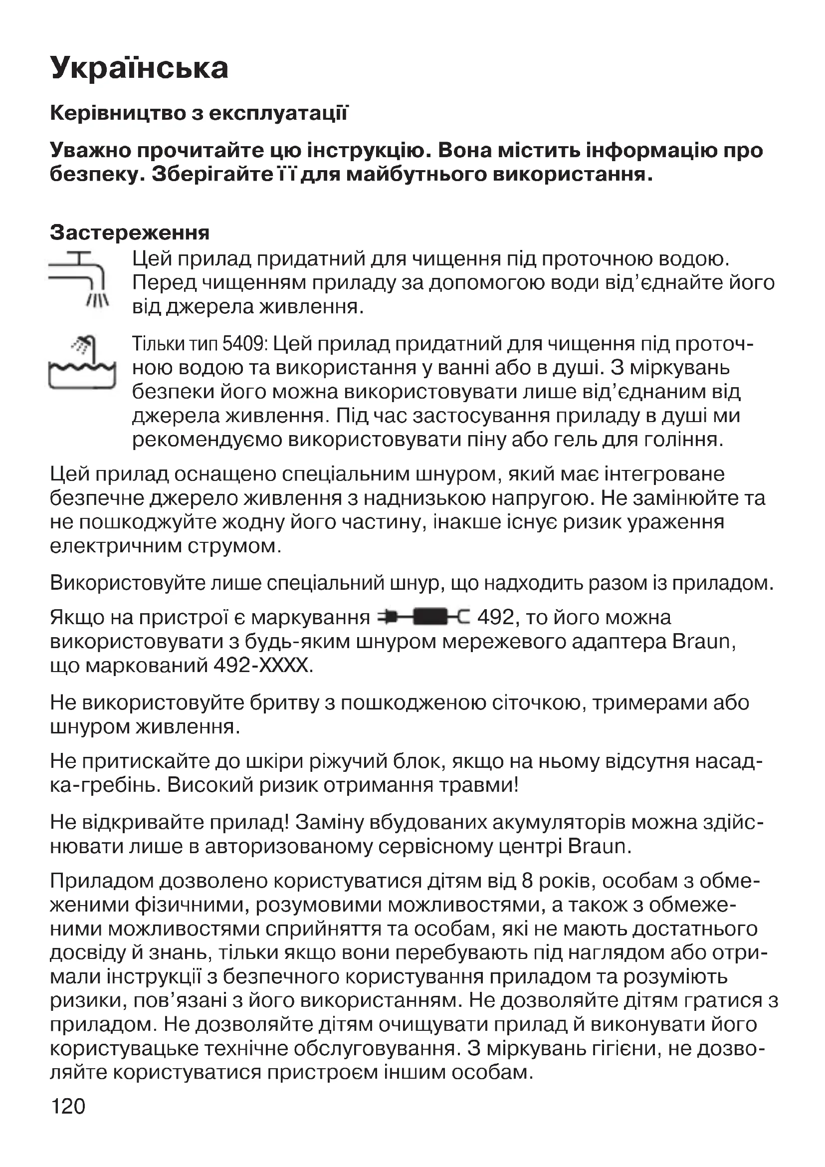 ы, вызванные форс-мажорными обстоятельствами; – использование в профессиональных целях; – нарушение требований инструкции по эксплуатации; – неправильная установка напряжения питающей сети (если это требуется); – внесение технических изменений; – механические повреждения; – повреждения по вине животных, грызунов и насекомых (в том числе случаи нахождения грызунов и насекомых внутри приборов); – для приборов, работающих от батареек, - работа с неподходящими или истощенными батарейками, любые повреждения, вызванные истощенными или текущими батарейками (советуем пользоваться только предохраненными от протекания батарейками); – для бритв – смятая или порванная сетка. Внимание! Оригинальный Гарантийный Талон подлежит изъятию при 91737906_Harmonia_3XX_310s_300s_BT_EURO_S6-136.indd 11891737906_Harmonia_3XX_310s_300s_BT_EURO_S6-136.indd 118 08.02.19 12:5708.02.19 12:57 Business Use - P&G AUTHORIZED POA-00106924 Rev 001 Effective Date 2019-02-14 Printed 2019-04-24 Page 118 of 136119 обращении в сервисный центр для гарантийного ремонта. После проведения ремонта Гарантийным Талоном будет являться заполненный оригинал Листа выполнения ремонта со штампом сервисного центра и подписанный потребителем по получении изделия из ремонта. Требуйте проставления даты возврата из ремонта, срок гарантии продлевается на время нахождения изделия в сервисном центре. В случае возникновения сложностей с выполнением гарантийного или послегарантийного обслуживания просьба сообщать об этом в Информационную Службу Сервиса Braun по телефону 8-800-200-20-20 (звонок из России бесплатный) 91737906_Harmonia_3XX_310s_300s_BT_EURO_S6-136.indd 11991737906_Harmonia_3XX_310s_300s_BT_EURO_S6-136.indd 119 08.02.19 12:5708.02.19 12:57 Business Use - P&G AUTHORIZED POA-00106924 Rev 001 Effective Date 2019-02-14 Printed 2019-04-24 Page 119 of 136120 Керівництво з експлуатації Уважно прочитайте цю інструкцію. Вона містить інформацію про безпеку. Зберігайте ї ї для майбутнього використання. Застереження Цей прилад придатний для чищення під проточною водою. Перед чищенням приладу за допомогою води від’єднайте його від джерела живлення. Тільки тип 5409: Цей прилад придатний для чищення під проточ- ною водою та використання у ванні або в душі. З міркувань безпеки його можна використовувати лише від’єднаним від джерела живлення. Під час застосування приладу в душі ми рекомендуємо використовувати піну або гель для гоління. Цей прилад оснащено спеціальним шнуром, який має інтегроване безпечне джерело живлення з наднизькою напругою. Не замінюйте та не пошкоджуйте жодну його частину, інакше існує ризик ураження електричним струмом. Використовуйте лише спеціальний шнур, що надходить разом із приладом. Якщо на пристрої є маркування 492, то його можна використовувати з будь-яким шнуром мережевого адаптера Braun, що маркований 492-ХХХХ. Не використовуйте бритву з пошкодженою сіточкою, тримерами або шнуром живлення. Не притискайте до шкіри ріжучий блок, якщо на ньому відсутня насад- ка-гребінь. Високий ризик отримання травми! Не відкривайте прилад! Заміну вбудованих акумуляторів можна здійс- нювати лише в авторизованому сервісному центрі Braun. Приладом дозволено користуватися дітям від 8 років, особам з обме- женими фізичними, розумовими можливостями, а також з обмеже- ними можливостями сприйняття та особам, які не мають достатнього досвіду й знань, тільки якщо вони перебувають під наглядом або отри- мали інструкції з безпечного користування приладом та розуміють ризики, пов’язані з його використанн