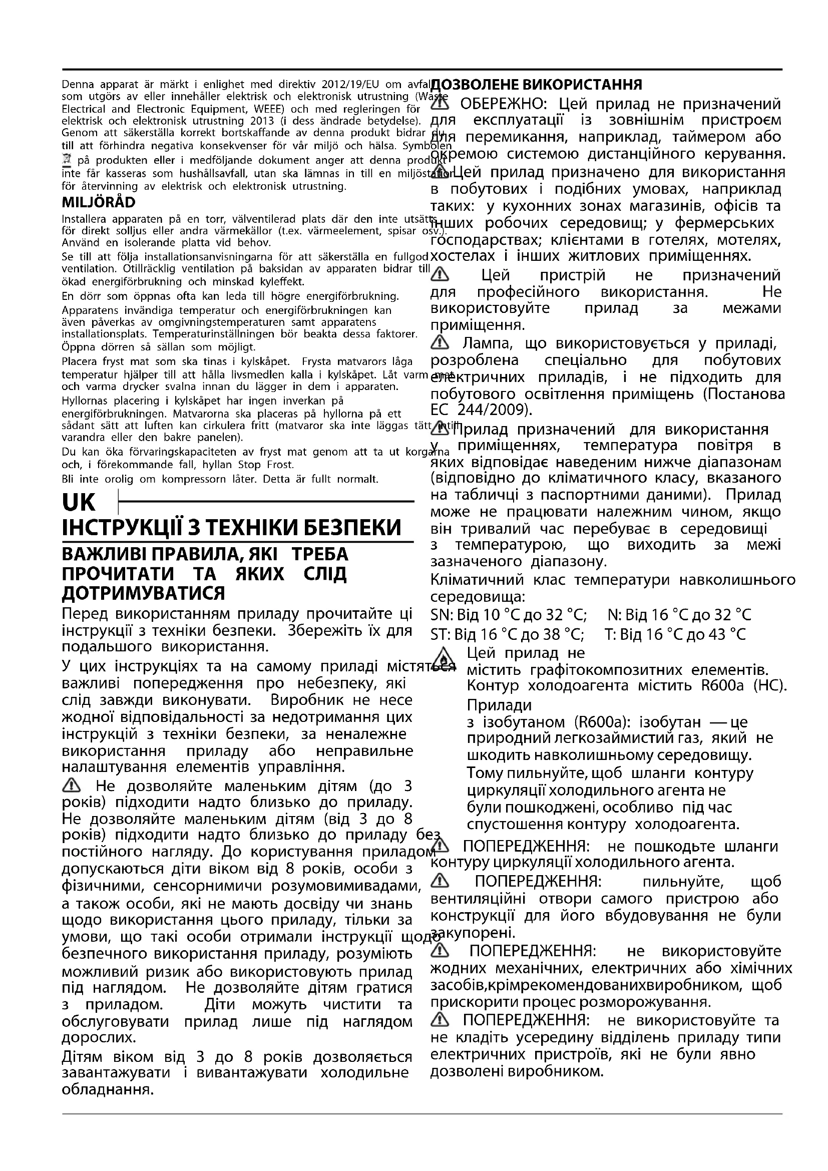 Дітям віком від 3 до 8 років дозволяється завантажувати і вивантажувати холодильне обладнання. ДОЗВОЛЕНЕ ВИКОРИСТАННЯ ОБЕРЕЖНО: Цей прилад не призначений для експлуатації із зовнішнім пристроєм для перемикання, наприклад, таймером або окремою системою дистанційного керування. Цей прилад призначено для використання в побутових і подібних умовах, наприклад таких: у кухонних зонах магазинів, офісів та інших робочих середовищ; у фермерських господарствах; клієнтами в готелях, мотелях, хостелах і інших житлових приміщеннях. Цей пристрій не призначений для професійного використання. Не використовуйте прилад за межами приміщення. Лампа, що використовується у приладі, розроблена спеціально для побутових електричних приладів, і не підходить для побутового освітлення приміщень (Постанова EC 244/2009). Прилад призначений для використання у приміщеннях, температура повітря в яких відповідає наведеним нижче діапазонам (відповідно до кліматичного класу, вказаного на табличці з паспортними даними). Прилад може не працювати належним чином, якщо він тривалий час перебуває в середовищі з температурою, що виходить за межі зазначеного діапазону. Кліматичний клас температури навколишнього середовища: SN: Від 10 °C до 32 °C; N: Від 16 °C до 32 °C ST: Від 16 °C до 38 °C; T: Від 16 °C до 43 °C Цей прилад не містить графітокомпозитних елементів. Контур холодоагента містить R600a (HC).