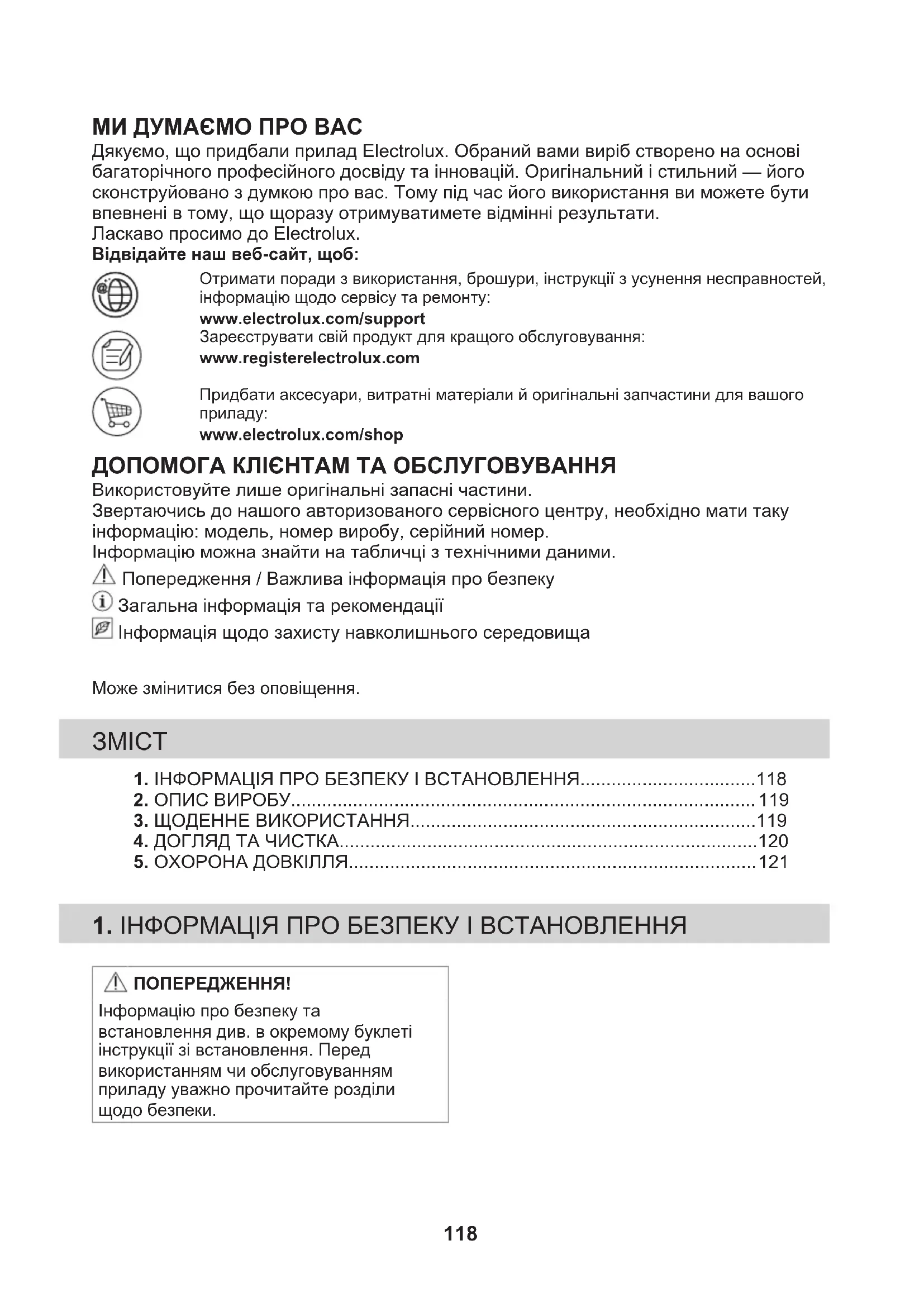 1. ІНФОРМАЦІЯ ПРО БЕЗПЕКУ І ВСТАНОВЛЕННЯ..................................118