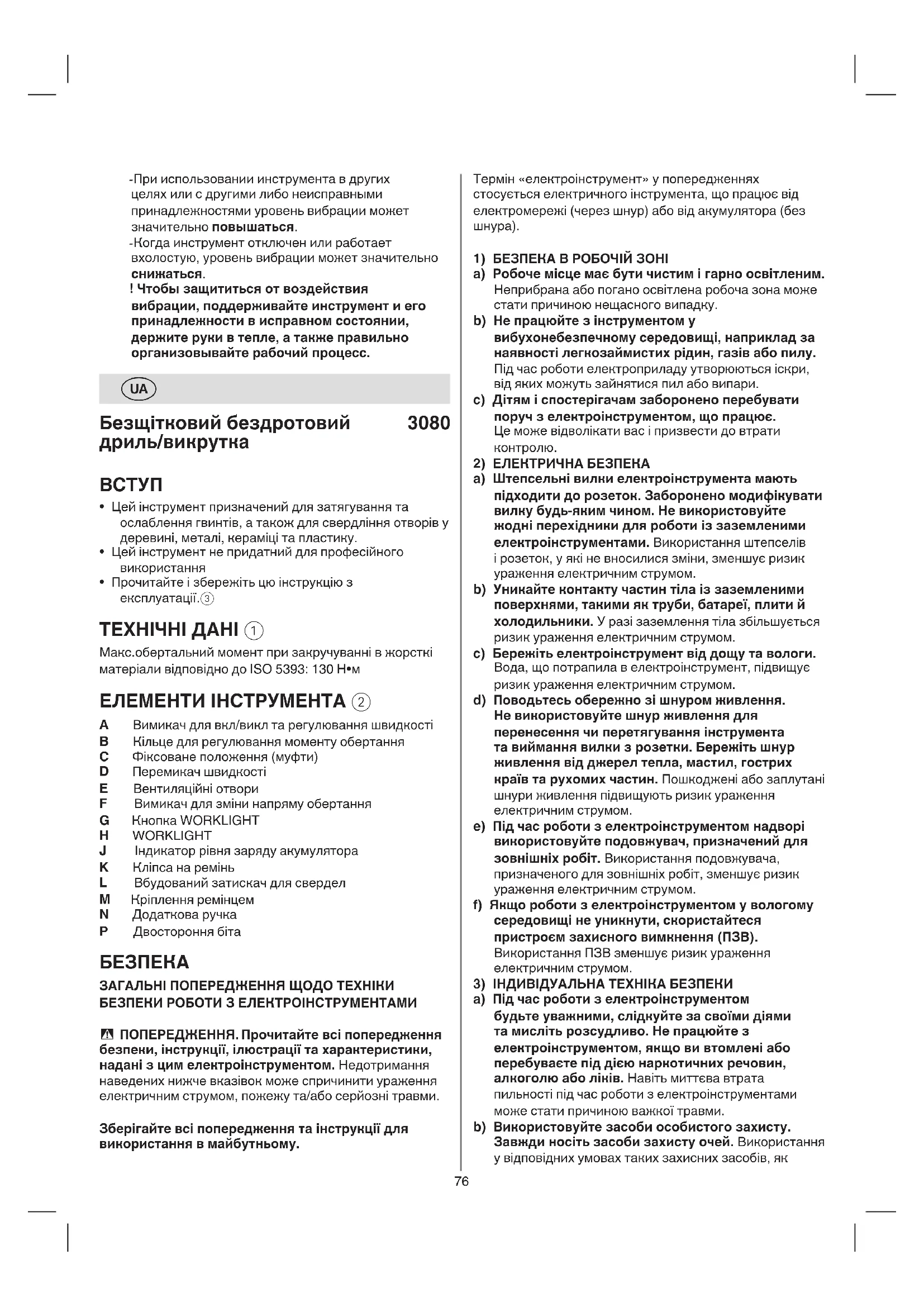 - Прочитайте і збережіть цю інструкцію з експлуатації.3 ТЕХНІЧНІ ДАНІ 1 Макс.обертальний момент при закручуванні в жорсткі матеріали відповідно до ISO 5393: 130 Н•м ЕЛЕМЕНТИ ІНСТРУМЕНТА 2 A Вимикач для вкл/викл та регулювання швидкості B Кільце для регулювання моменту обертання C Фіксоване положення (муфти) D Перемикач швидкості E Вентиляційні отвори F Вимикач для зміни напряму обертання G Кнопка WORKLIGHT H WORKLIGHT