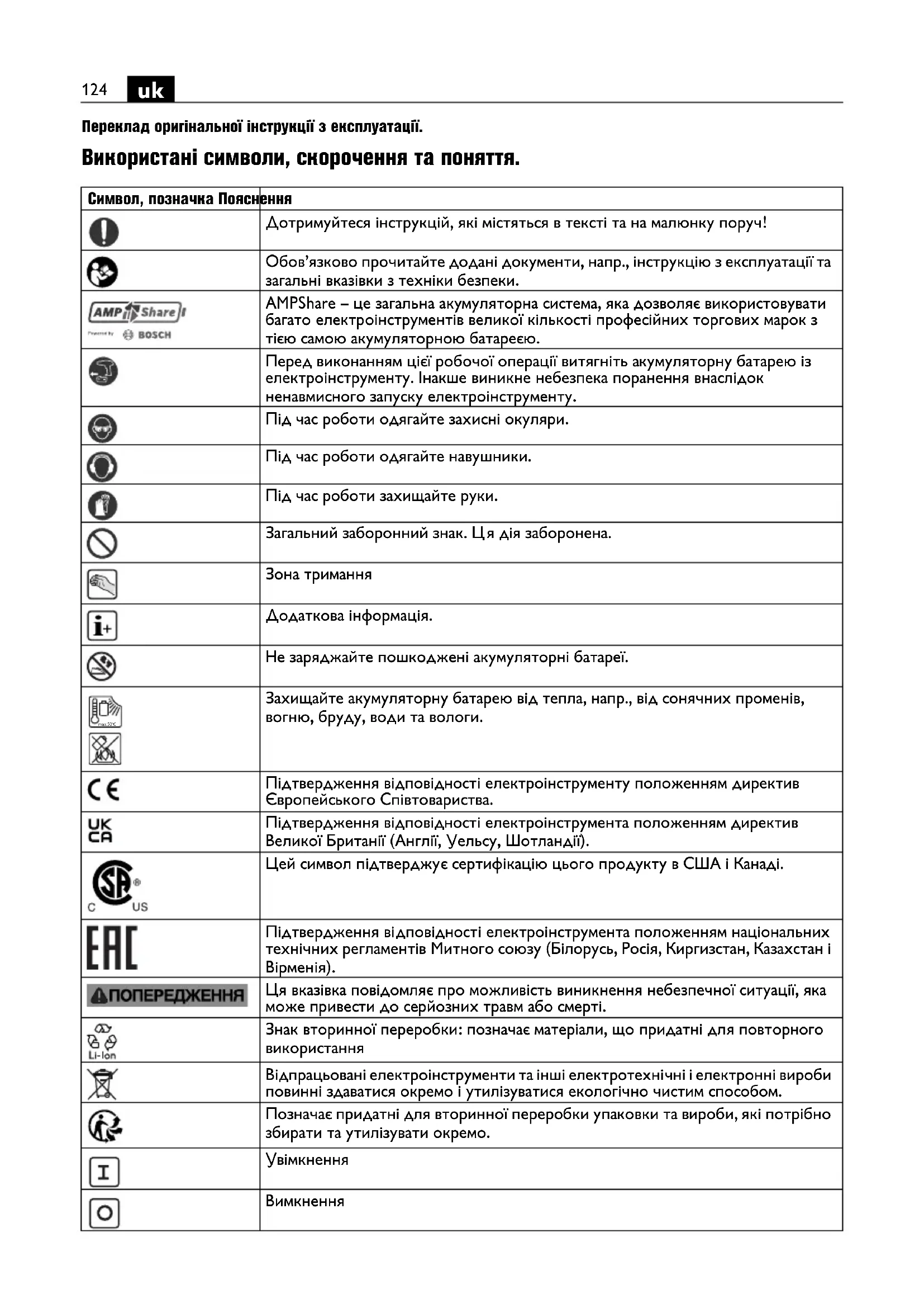 Переклад оригінальної інструкції з експлуатації. Використані символи, скорочення та поняття. Символ, позначка Пояснення Дотримуйтеся інструкцій, які містяться в тексті та на малюнку поруч! Обов’язково прочитайте додані документи, напр., інструкцію з експлуатації та загальні вказівки з техніки безпеки. AMPShare – це загальна акумуляторна система, яка дозволяє використовувати багато електроінструментів великої кількості професійних торгових марок з тією самою акумуляторною батареєю. Перед виконанням цієї робочої операції витягніть акумуляторну батарею із електроінструменту. Інакше виникне небезпека поранення внаслідок ненавмисного запуску електроінструменту. Під час роботи одягайте захисні окуляри. Під час роботи одягайте навушники. Під час роботи захищайте руки. Загальний заборонний знак. Ц я дія заборонена. Зона тримання Додаткова інформація. Не заряджайте пошкоджені акумуляторні батареї. Захищайте акумуляторну батарею від тепла, напр., від сонячних променів, вогню, бруду, води та вологи. Підтвердження відповідності електроінструменту положенням директив Європейського Співтовариства. Підтвердження відповідності електроінструмента положенням директив Великої Британії (Англії, Уельсу, Шотландії). Цей символ підтверджує сертифікацію цього продукту в США і Канаді. Підтвердження ві дповідності електроінструмента положенням національних технічних регламентів Митного союзу (Білорусь, Росія, Киргизстан, Казахстан і