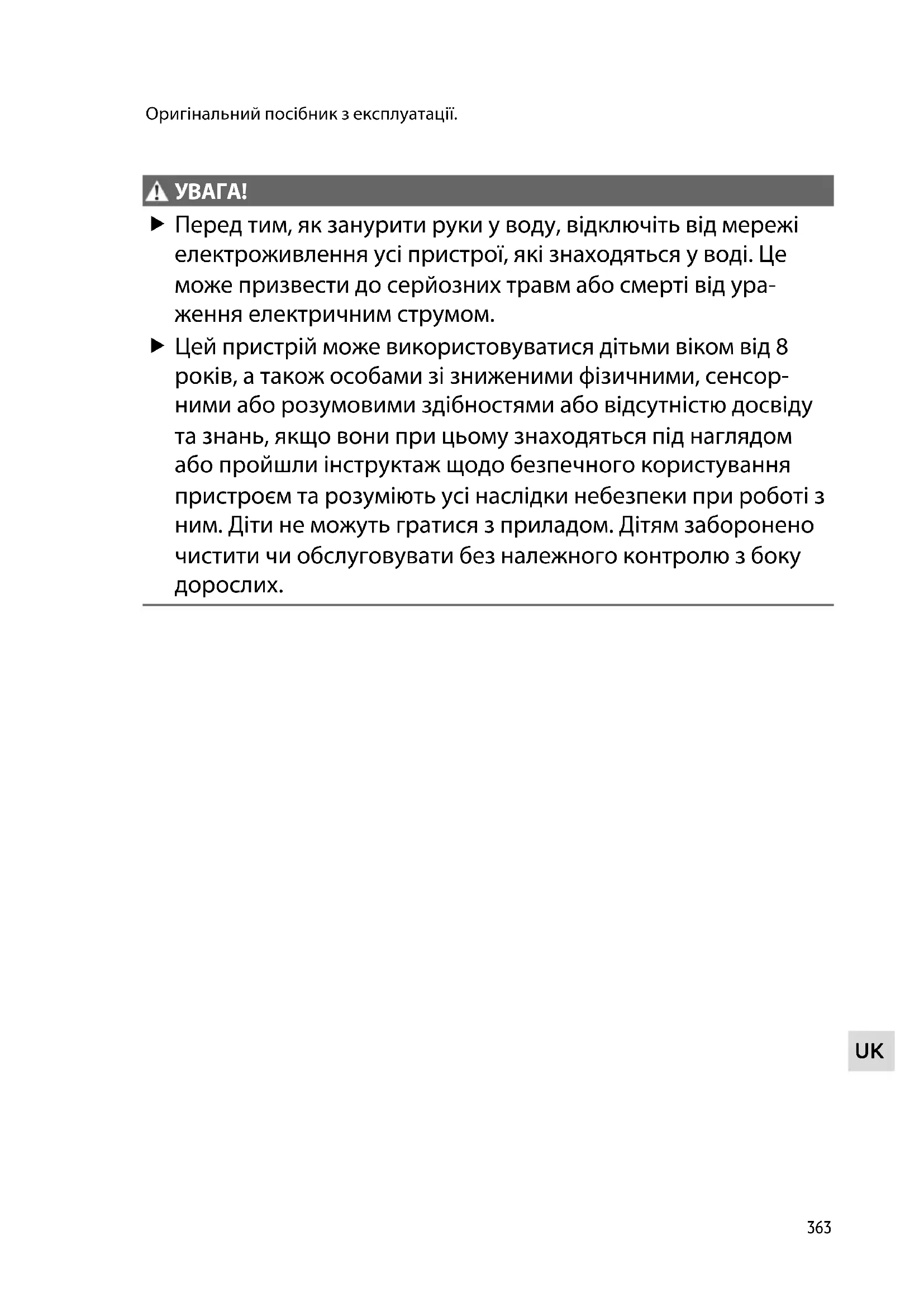Перед тим, як занурити руки у воду, відключіть від мережі електроживлення усі пристрої, які знаходяться у воді. Це може призвести до серйозних травм або смерті від ура- ження електричним струмом. Цей пристрій може використовуватися дітьми віком від 8 років, а також особами зі зниженими фізичними, сенсор- ними або розумовими здібностями або відсутністю досвіду та знань, якщо вони при цьому знаходяться під наглядом або пройшли інструктаж щодо безпечного користування пристроєм та розуміють усі наслідки небезпеки при роботі з ним. Діти не можуть гратися з приладом. Дітям заборонено чистити чи обслуговувати без належного контролю з боку дорослих.364 Інструкція з техніки безпеки Електричне приєднання