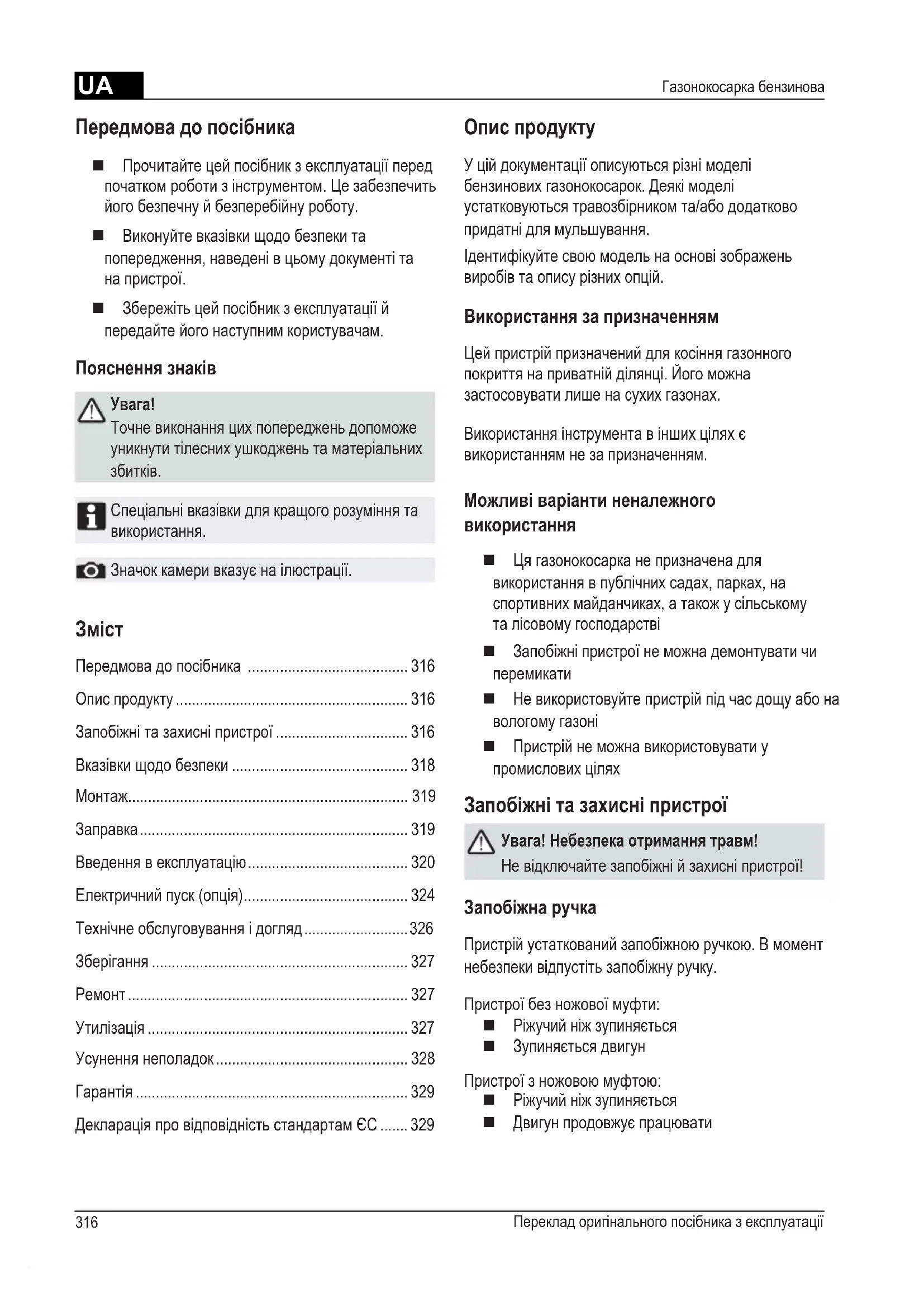 Спеціальнівказівкидлякращогорозуміннята використання. Значоккамеривказуєнаілюстрації. Опис продукту Уційдокументаціїописуютьсярізнімоделі бензиновихгазонокосарок.Деякімоделі устатковуютьсятравозбірникомта/абододатково придатнідлямульшування. Ідентифікуйтесвоюмодельнаосновізображень виробівтаописурізнихопцій. Використання за призначенням Цейпристрійпризначенийдлякосіннягазонного покриттянаприватнійділянці.Йогоможна застосовуватилишенасухихгазонах. Використанняінструментавіншихціляхє використаннямнезапризначенням. Можливі варіанти неналежного використання Цягазонокосарканепризначенадля використаннявпублічнихсадах,парках,на спортивнихмайданчиках,атакожусільському талісовомугосподарстві Запобіжніпристроїнеможнадемонтуватичи