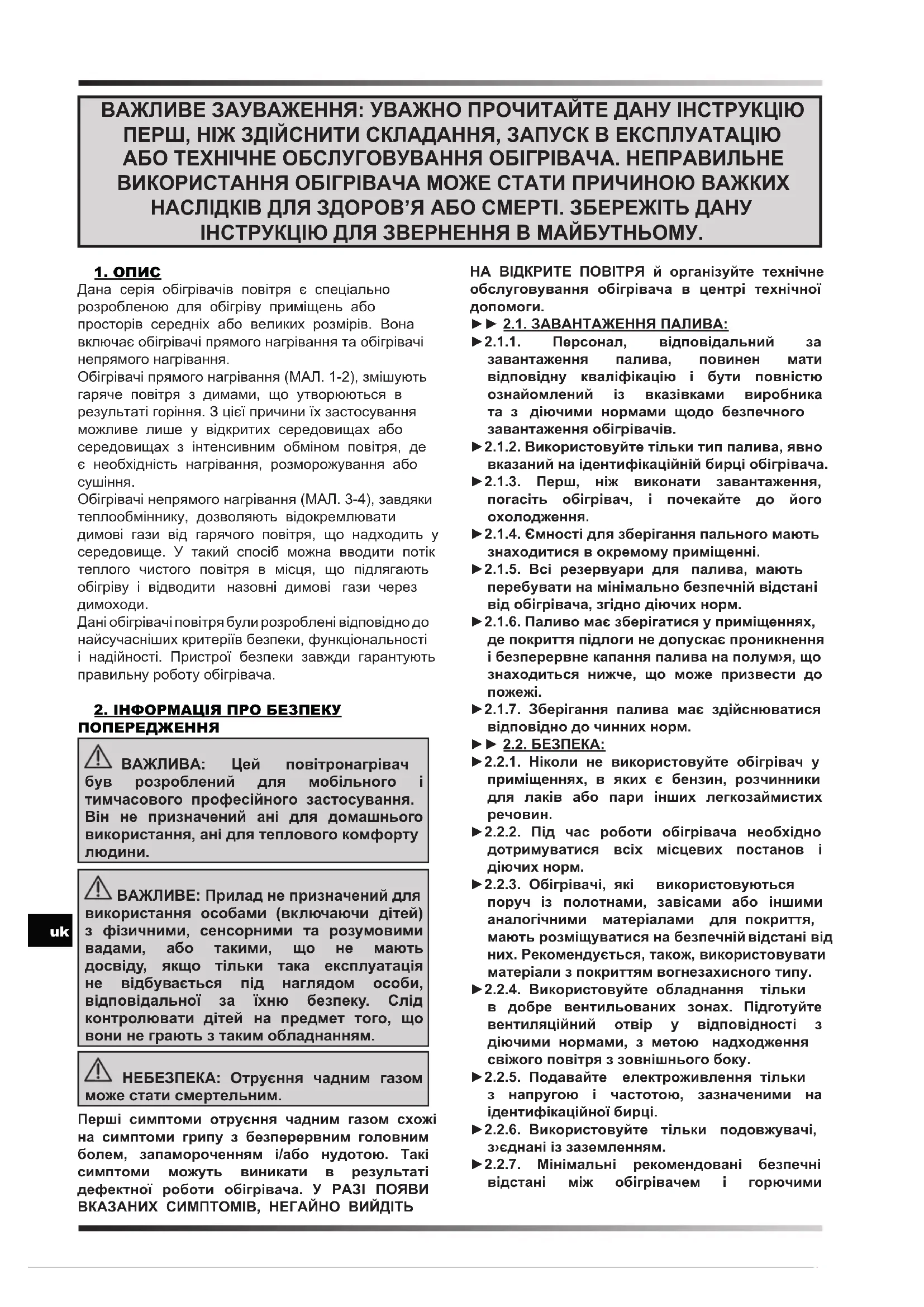 ►2.1.7. Зберігання палива має здійснюватися відповідно до чинних норм. ►► 2.2. БЕЗПЕКА: ►2.2.1. Ніколи не використовуйте обігрівач у приміщеннях, в яких є бензин, розчинники для лаків або пари інших легкозаймистих