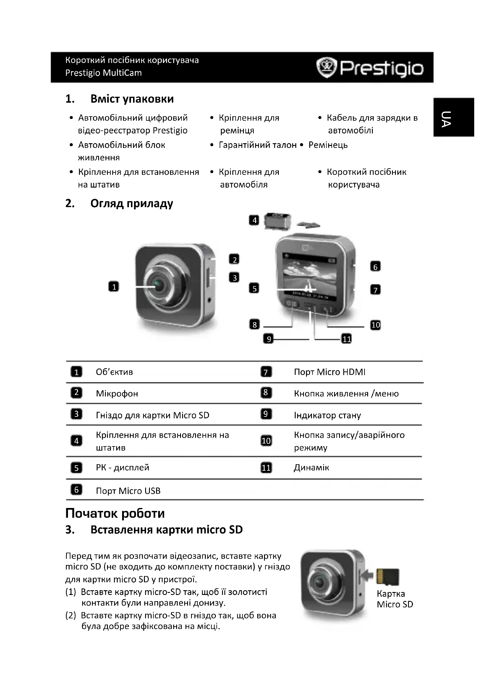 Micro SD Перед тим як розпочати відеозапис, вставте картку micro SD (не входить до комплекту поставки) у гніздо для картки micro SD у пристрої. (1) Вставте картку micro-SD так, щоб її золотисті контакти були направлені донизу. (2) Вставте картку micro-SD в гніздо так, щоб вона була добре зафіксована на місці.Короткий посібник користувача Prestigio MultiCam