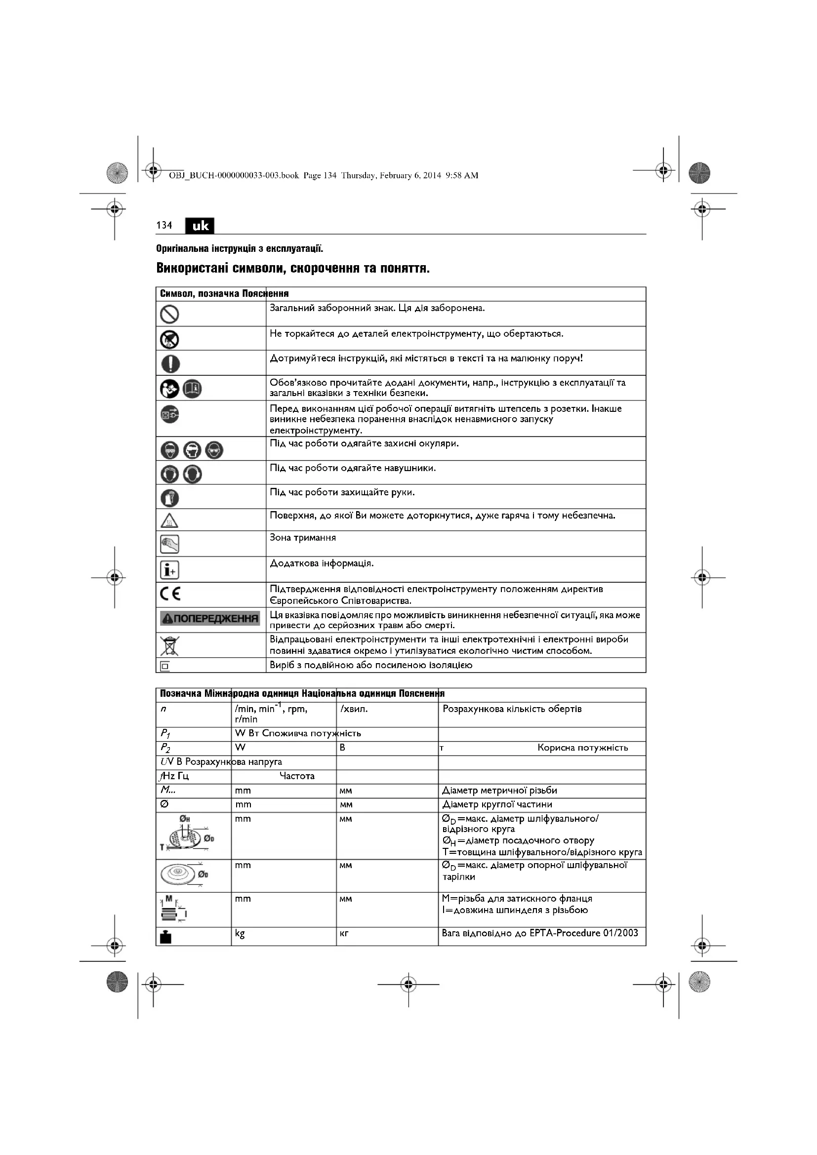 Оригінальна інструкція з експлуатації. Використані символи, скорочення та поняття. Символ, позначка Пояснення Загальний заборонний знак. Ця дія заборонена. Не торкайтеся до деталей електроінструменту, що обертаються. Дотримуйтеся інструкцій, які містяться в тексті та на малюнку поруч! Обов’язково прочитайте додані документи, напр., інструкцію з експлуатації та загальні вказівки з техніки безпеки. Перед виконанням цієї робочої операції витягніть штепсель з розетки. Інакше виникне небезпека поранення внаслідок ненавмисного запуску електроінструменту. Під час роботи одягайте захисні окуляри. Під час роботи одягайте навушники. Під час роботи захищайте руки. Поверхня, до якої Ви можете доторкнутися, дуже гаряча і тому небезпечна. Зона тримання Додаткова інформація. Підтвердження відповідності електроінструменту положенням директив Європейського Співтовариства. Ця вказівка повідомляє про можливість виникнення небезпечної ситуації, яка може привести до серйозних травм або смерті. Відпрацьовані електроінструменти та інші електротехнічні і електронні вироби повинні здаватися окремо і утилізуватися екологічно чистим способом. Виріб з подвійною або посиленою ізоляцією Позначка Міжнародна одиниця Національна одиниця Пояснення
