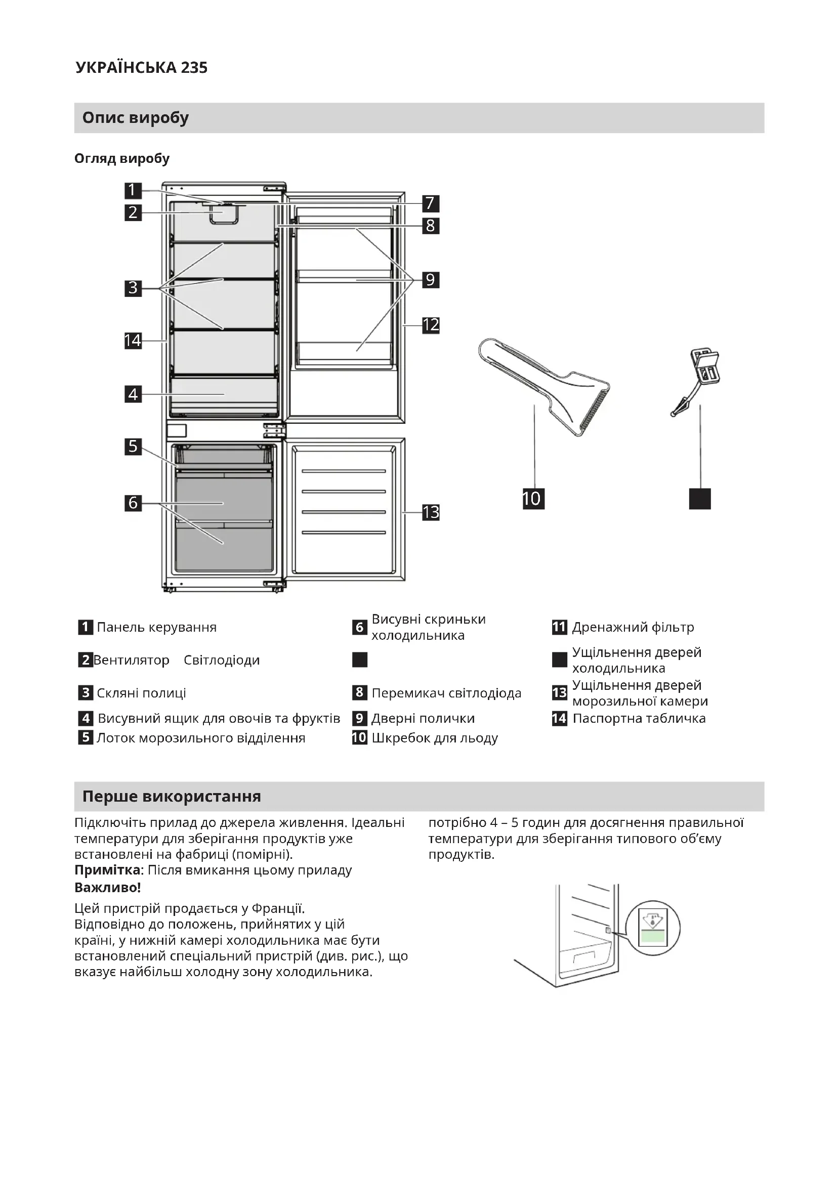 Шкребок для льоду Перше використання Підключіть прилад до джерела живлення. Ідеальні температури для зберігання продуктів уже встановлені на фабриці (помірні). Примітка: Після вмикання цьому приладу потрібно 4 – 5годин для досягнення правильної температури для зберігання типового об’єму