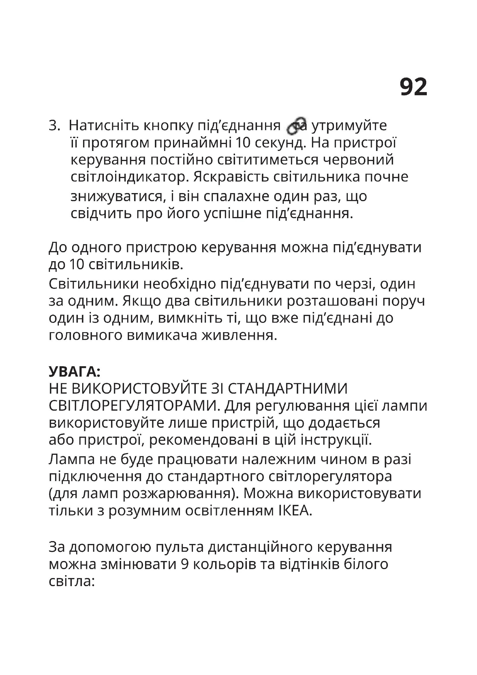 НЕ ВИКОРИСТОВУЙТЕ ЗІ СТАНДАРТНИМИ СВІТЛОРЕГУЛЯТОРАМИ. Для регулювання цієї лампи використовуйте лише пристрій, що додається або пристрої, рекомендовані в цій інструкції. Лампа не буде працювати належним чином в разі підключення до стандартного світлорегулятора (для ламп розжарювання). Можна використовувати тільки з розумним освітленням ІКЕА. За допомогою пульта дистанційного керування можна змінювати 9 кольорів та відтінків білого світла:93