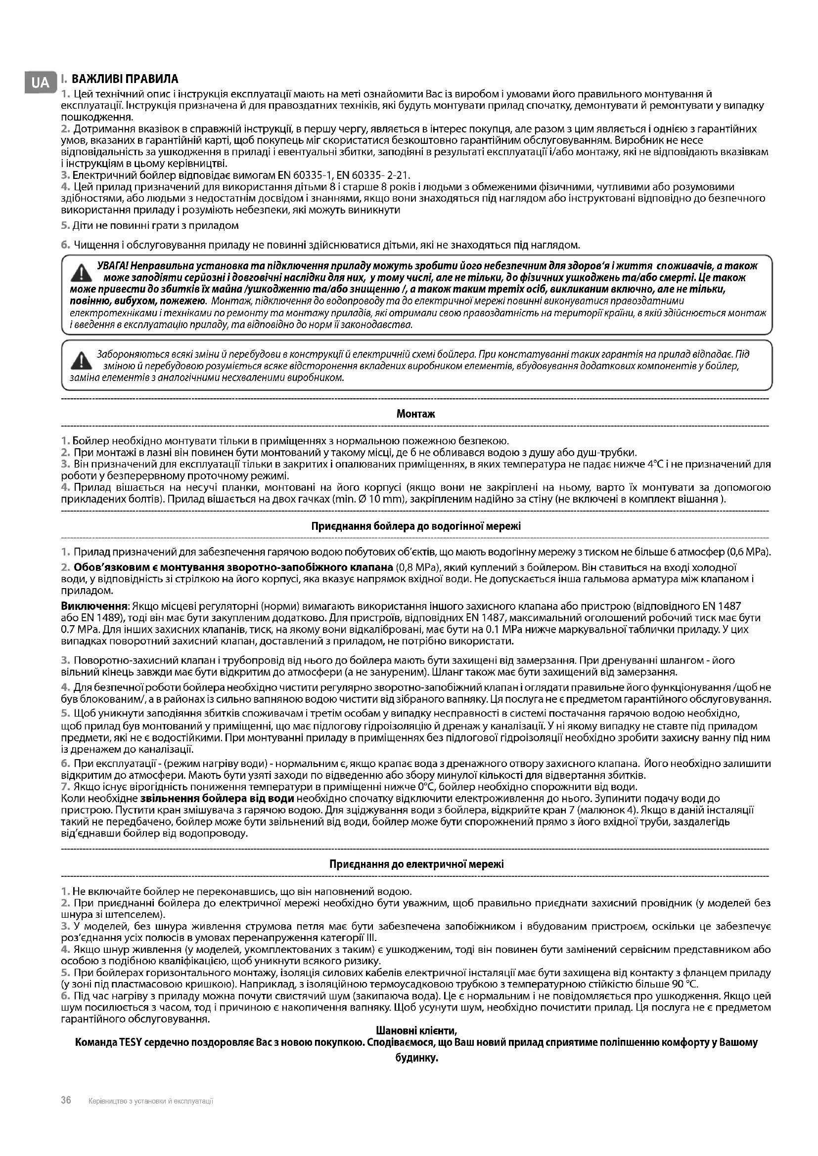 2. При приєднанні бойлера до електричної мережі необхідно бути уважним, щоб правильно приєднати захисний провідник (у моделей без шнура зі штепселем). 3. У моделей, без шнура живлення струмова петля має бути забезпечена запобіжником і вбудованим пристроєм, оскільки це забезпечує роз‘єднання усіх полюсів в умовах перенапруження категорії III. 4. Якщо шнур живлення (у моделей, укомплектованих з таким) є ушкодженим, тоді він повинен бути замінений сервісним представником або особою з подібною кваліфікацією, щоб уникнути всякого ризику. 5. При бойлерах горизонтального монтажу, iзоляція силових кабелів електричної інсталяції має бути захищена від контакту з фланцем приладу (у зоні під пластмасовою кришкою). Наприклад, з ізоляційною термоусадковою трубкою з температурною стійкістю більше 90 °C. 6. Під час нагріву з приладу можна почути свистячий шум (закипаюча вода). Це є нормальним і не повідомляється про ушкодження. Якщо цей шум посилюється з часом, тод і причиною є накопичення вапняку. Щоб усунути шум, необхідно почистити прилад. Ця послуга не є предметом гарантійного обслуговування. Шановні клієнти, Команда TESY сердечно поздоровляє Вас з новою покупкою. Сподіваємося, що Ваш новий прилад сприятиме поліпшенню комфорту у Вашому будинку.Українська Керівництво з установки й експлуатації 37