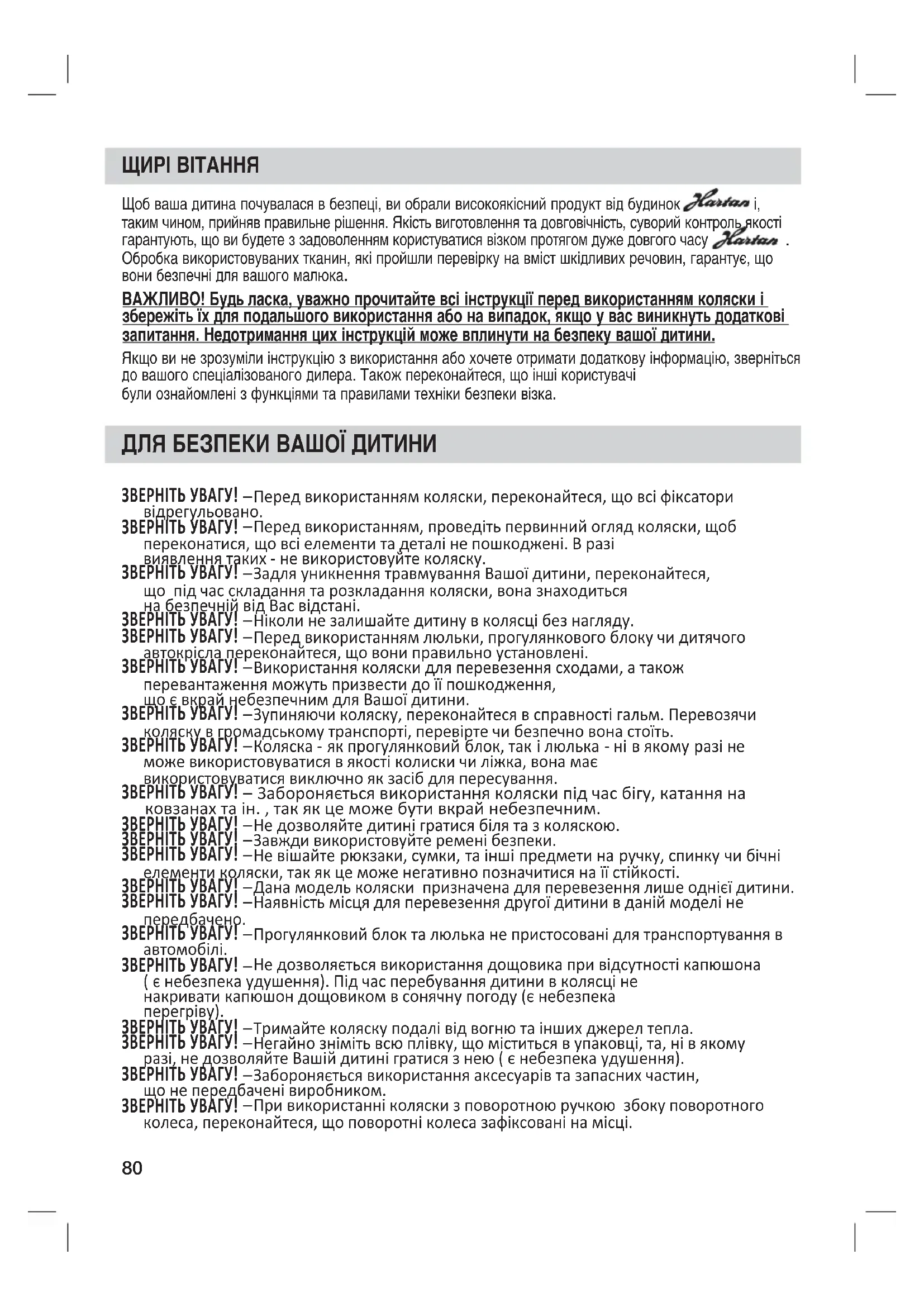 ЩИРІ ВІТАННЯ Щоб ваша дитина почувалася в безпеці, ви обрали високоякісний продукт від будинок і, таким чином, прийняв правильне рішення. Якість виготовлення та довговічність, суворий контроль якості гарантують, що ви будете з задоволенням користуватися візком протягом дуже довгого часу . Обробка використовуваних тканин, які пройшли перевірку на вміст шкідливих речовин, гарантує, що вони безпечні для вашого малюка. ВАЖЛИВО! Будь ласка, уважно прочитайте всі інструкції перед використанням коляски і збережіть їх для подальшого використання або на випадок, якщо у вас виникнуть додаткові запитання. Недотримання цих інструкцій може вплинути на безпеку вашої дитини. Якщо ви не зрозуміли інструкцію з використання або хочете отримати додаткову інформацію, зверніться до вашого спеціалізованого дилера. Також переконайтеся, що інші користувачі були ознайомлені з функціями та правилами техніки безпеки візка. ʯʦʫˀʻʳ˃ː˄ʦʤʧ˄