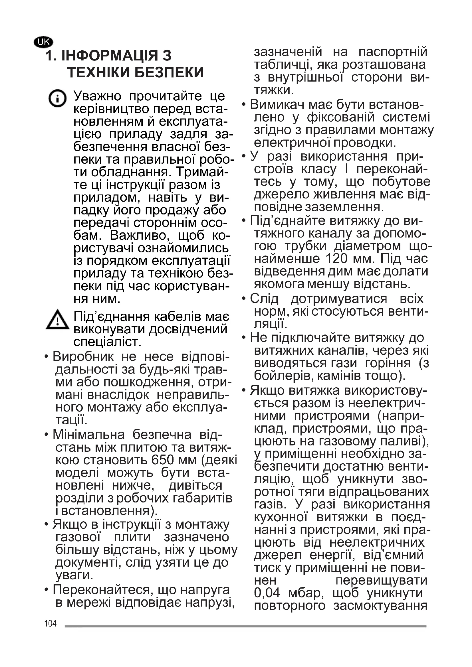 - Якщо витяжка використову- ється разом із неелектрич- ними пристроями (напри- клад, пристроями, що пра- цюють на газовому паливі), у приміщенні необхідно за- безпечити достатню венти- ляцію, щоб уникнути зво- ротної тяги відпрацьованих газів. У разі використання кухонної витяжки в поєд- нанні з пристроями, які пра- цюють від неелектричних джерел енергії, від’ємний тиск у приміщенні не пови- нен перевищувати 0,04 мбар, щоб уникнути повторного засмоктування 104витяжкою газів назад у при-
