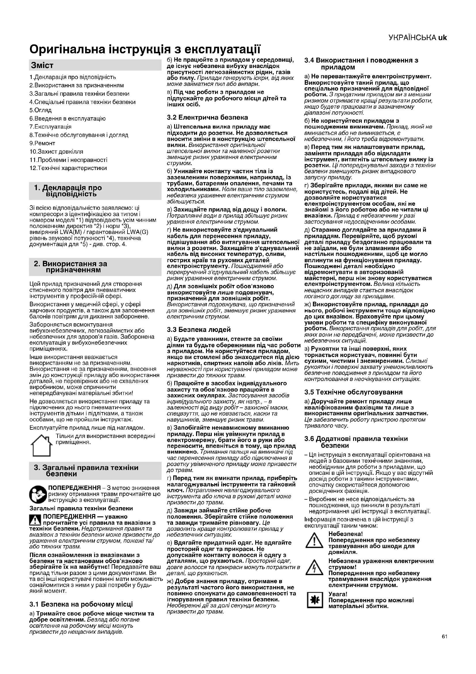 – Дотримуйтесь спеціальних правил техніки безпеки, наведених у відповідних розділах. – При потребі дотримуйтеся директив професійного союзу або правил запобігання нещасним випадкам для поводження з компресорами та пневматичними інструментами. – Дотримуйтеся законодавчих приписів щодо експлуатації установок, які потребують