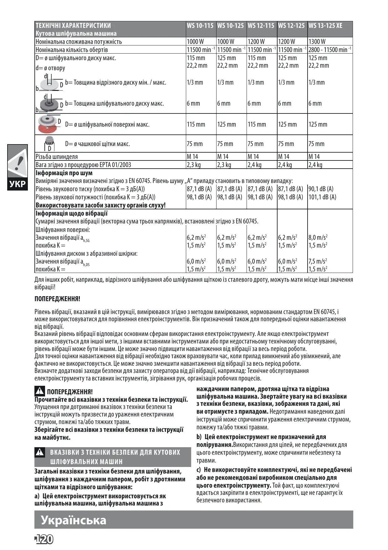 WS 10-115 WS 10-125 WS 12-115 WS 12-125 WS 13-125 XE 1000 W 1000 W 1200 W 1200 W 1300 W 11500 min -1 11500 min -1 11500 min -1 11500 min -1 2800 - 11500 min -1 115 mm 125 mm 115 mm 125 mm 125 mm 22,2 mm 22,2 mm 22,2 mm 22,2 mm 22,2 mm b= Товщина відрізного диску мін. / макс. 1/3 mm 1/3 mm 1/3 mm 1/3 mm 1/3 mm b= Товщина шліфувального диску макс. 6 mm 6 mm 6 mm 6 mm 6 mm D= ø шліфувальної поверхні макс. 115 mm 125 mm 115 mm 125 mm 125 mm D= ø чашкової щітки макс. 75 mm 75 mm 75 mm 75 mm 75 mm Різьба шпинделя M 14 M 14 M 14 M 14 M 14 Вага згідно з процедурою EPTA 01/2003 2,3 kg 2,3 kg 2,4 kg 2,4 kg 2,4 kg Інформація про шум Виміряні значення визначені згідно з EN 60745. Рівень шуму „А“ приладу становить в типовому випадку: Рівень звукового тиску (похибка K = 3 дБ(A)) 87,1 dB (A) 87,1 dB (A) 87,1 dB (A) 87,1 dB (A) 90,1 dB (A) Рівень звукової потужності (похибка K = 3 дБ(A)) 98,1 dB (A) 98,1 dB (A) 98,1 dB (A) 98,1 dB (A) 101,1 dB (A) Використовувати засоби захисту органів слуху! Інформація щодо вібрації Сумарні значення вібрації (векторна сума трьох напрямків), встановлені згідно з EN 60745. Шліфування поверхні: Значення вібрації ah,SG 6,2 m/s2 6,2 m/s2 6,2 m/s2 6,2 m/s2 8,0 m/s2