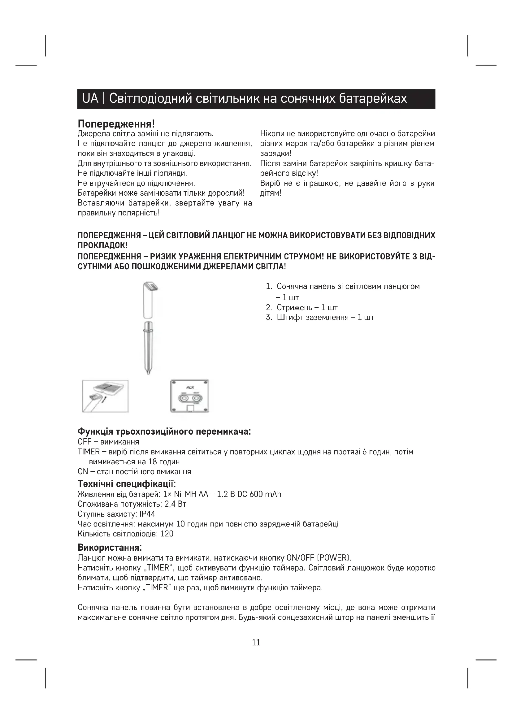 Функція трьохпозиційного перемикача: OFF – вимикання TIMER – виріб після вмикання світиться у повторних циклах щодня на протязі 6 годин, потім вимикається на 18 годин ON – стан постійного вмикання Технічні специфікації: Живлення від батарей: 1× Ni-MH AA – 1.2 В DC 600 mAh Споживана потужність: 2,4 Вт Ступінь захисту: IP44 Час освітлення: максимум 10 годин при повністю зарядженій батарейці Кількість світлодіодів: 120 Використання: Ланцюг можна вмикати та вимикати, натискаючи кнопку ON/OFF (POWER). Натисніть кнопку „TIMER“, щоб активувати функцію таймера. Світловий ланцюжок буде коротко блимати, щоб підтвердити, що таймер активовано. Натисніть кнопку „TIMER“ ще раз, щоб вимкнути функцію таймера. Сонячна панель повинна бути встановлена в добре освітленому місці, де вона може отримати максимальне сонячне світло протягом дня. Будь-який сонцезахисний штор на панелі зменшить її12 здатність поглинати сонячне світло та зменшить яскравість і термін служби світлодіодного світиль- ника. Сонячні панелі не повинні бути в місці, де на них може вплинути дощ або сніг. Цей світильник можна повісити на гілки, кущі, дахи, жолоби, паркани або будь-яке інше місце, яке ви хочете. Коробку сонячної панелі можна розмістити на землі за допомогою заземлюючої основи. Основа повинна бути міцно закріплена в землі. Переконайтеся, що сонячні панелі спрямовані до сонця. Для освітлення потрібно не менше 6 годин сонячного світла. Незважаючи на те, що сонячні панелі продовжуватимуть збирати енергію в похмурі дні, дощові дні або сніг, ємність накопичувача енергії та час освітлення будуть зменшені. Наприклад, сонячні дні можуть забезпечити не менше 3–4 годин освітлення, а дощові або сніжні дні можуть забезпечити лише 1–2 години освітлення. ТОВ «EMOS spol. s.r.o» заявляє, що світлодіодний світильник на сонячних батарейках відповідає основним вимогам та іншим відповідним положенням директиви. Пристроєм можна вільно користува- тися в ЄС. Декларацію про відповідність можна знайти на веб-сайті http://www.emos.eu/download. RO|MD | LED lampă solară ATENȚIONARE! Sursele de lumină nu sunt înlocuibile. Nu conectați lanțul la alimentare dacă este în ambalaj. Pentru uz interior și exterior. Nu conectați altă lumină de Crăciun. Nu interveniți la conectare. Bateriile pot înlocuite numai de un adult! La introducerea bateriilor respectați polaritatea corectă! Nu utilizați concomitent baterii de diferite mărci și/sau baterii cu nivel diferit de încărcare! După înlocuirea bateriilor, atașați capacul loca- șului bateriilor! Produsul nu este o jucărie, nu-l lăsați la înde- mâna copiilor! AVERTISMENT - ACEST LANȚ LUMINOS NU TREBUIE UTILIZAT FĂRĂ GARNITURILE CORESPUN- ZĂTOARE! AVERTISMENT - RISC DE RĂNIRE PRIN CURENT ELECTRIC! NU UTILIZAȚI CU SURSE DE LUMINĂ