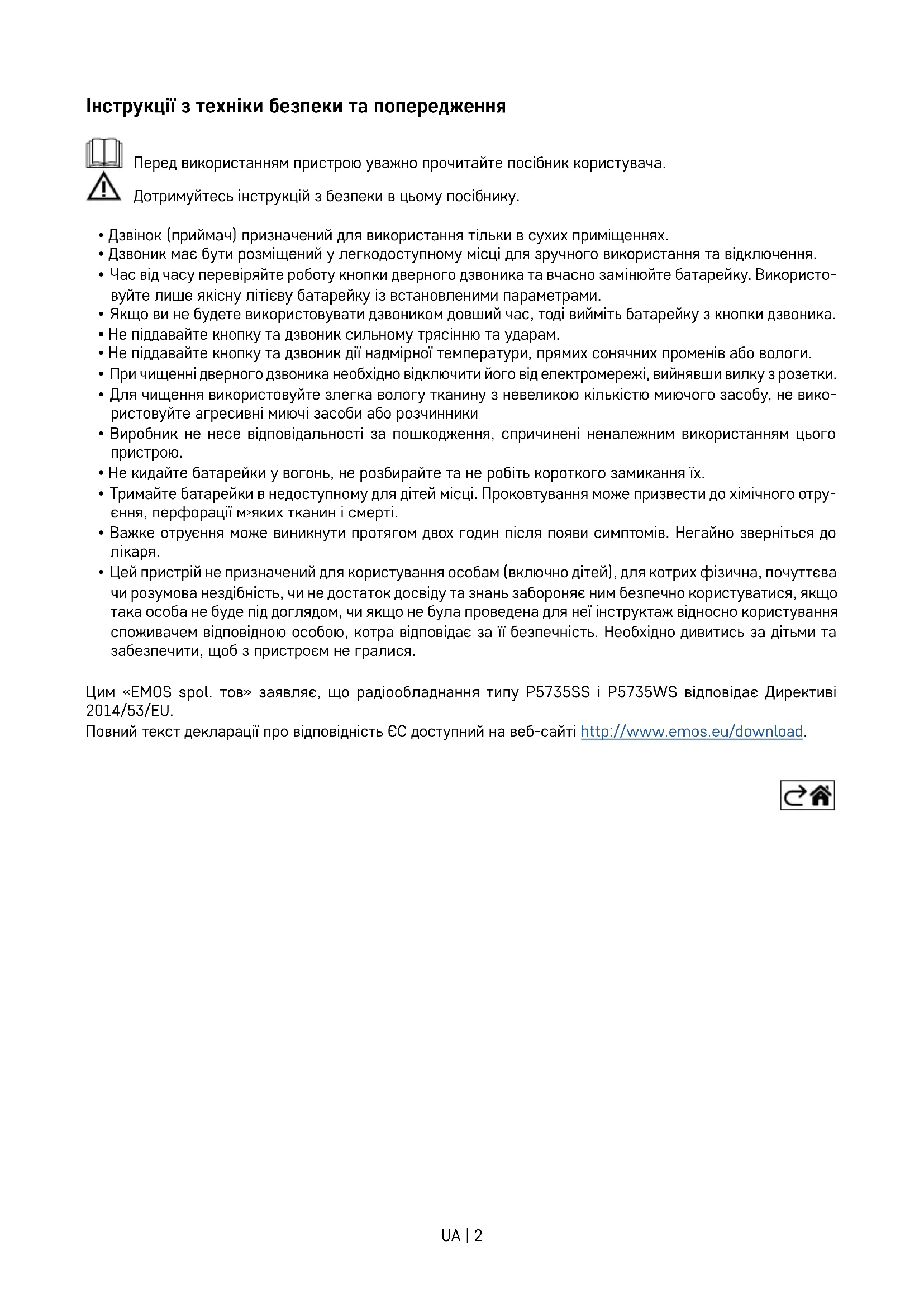 - Цей пристрій не призначений для користування особам (включно дітей), для котрих фізична, почуттєва чи розумова нездібність, чи не достаток досвіду та знань забороняє ним безпечно користуватися, якщо така особа не буде під доглядом, чи якщо не була проведена для неї інструктаж відносно користування споживачем відповідною особою, котра відповідає за її безпечність. Необхідно дивитись за дітьми та забезпечити, щоб з пристроєм не гралися. Цим «EMOS spol. тов» заявляє, що радіообладнання типу P5735SS і P5735WS відповідає Директиві 2014/53/EU. Повний текст декларації про відповідність ЄС доступний на веб-сайті http://www.emos.eu/download.UA | 3 80 mm 38 mm 19 mm 65 mm 80 mm 92 mm Технічна специфікація Дальність передачі: до 150 м на відкритому про- сторі (в населених пунктах може знизитися до п›ятої частини) Кнопка: водонепроникна; Захист IP44 Поєднання дверного дзвоника з кнопками: функція „self-learning“. Кількість сполучень: максимум 8 кнопок на 1 дзвоник, максимум 2 кнопки на 1 дзво- ник у додатку EMOS GoSmart Кількість мелодій: 52 Частота передачі: 433,92 МГц, 10 мВт e.r.p. макс. Живлення дверного дзвоника: 230 В змінного струму/50 Гц Кнопкове живлення: батарейка 1× 3 В (тип CR2032, в комплекті) У комплект поставки входить: двостороння клейка стрічкаUA | 4