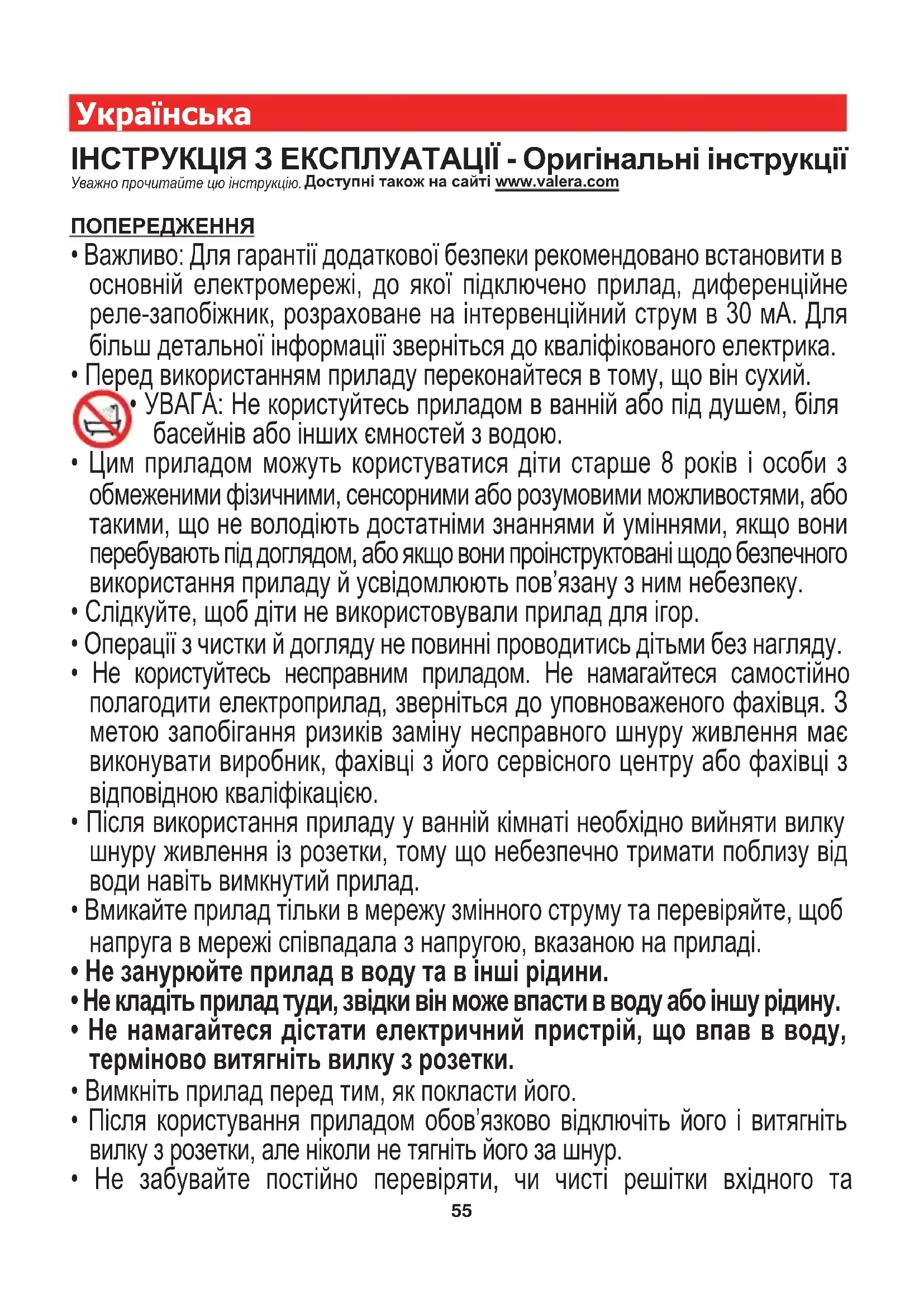 - УВАГА: Не користуйтесь приладом в ванній або під душем, біля басейнів або інших ємностей з водою.