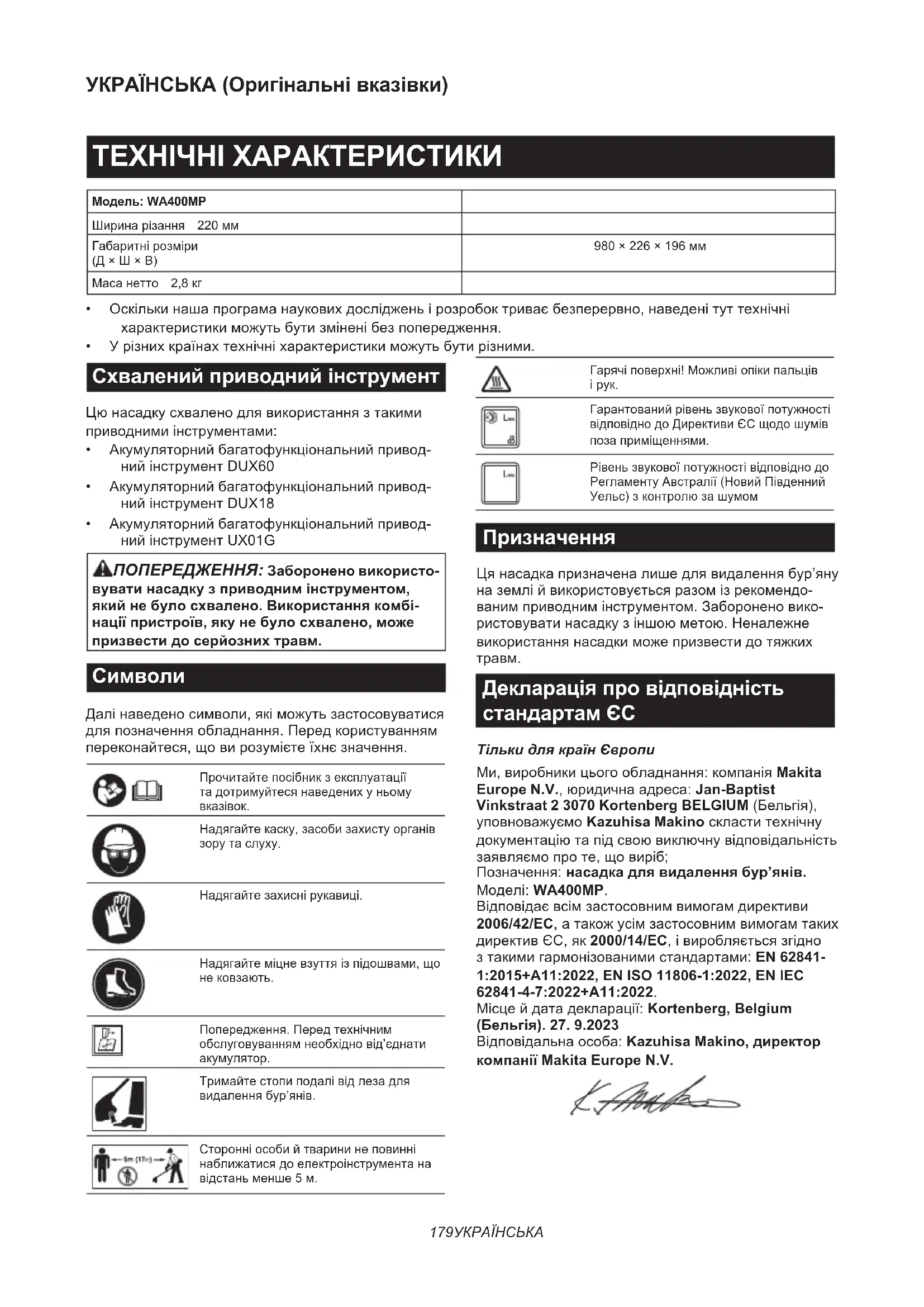 62841-4-7:2022+A11:2022. Місцейдатадекларації:Kortenberg, Belgium (Бельгія). 27. 9.2023 Відповідальнаособа:Kazuhisa Makino, директор компанії Makita Europe N.V.180 УКРАЇНСЬКА ПОПЕРЕДЖЕННЯ ПРО ДОТРИМАННЯ ТЕХНІКИ