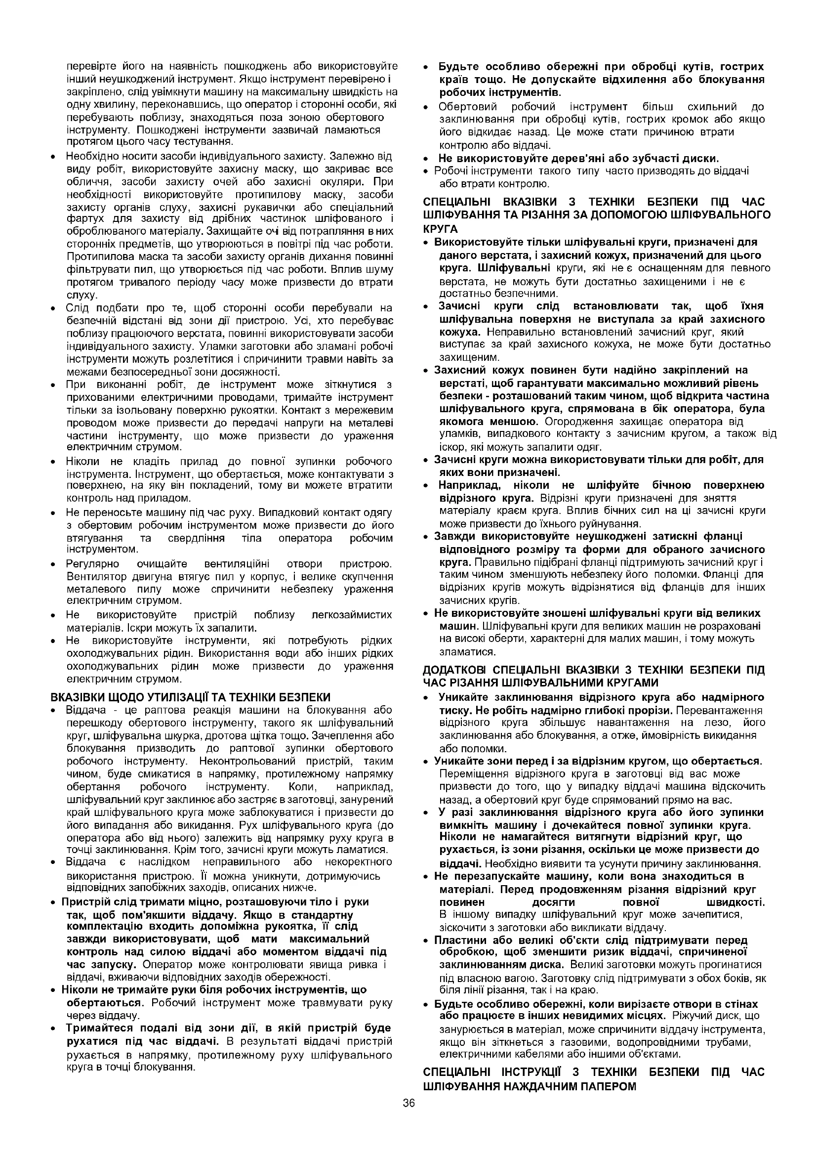 - Робочі інструменти такого типу часто призводять до віддачі або втрати контролю. СПЕЦІАЛЬНІ ВКАЗІВКИ З ТЕХНІКИ БЕЗПЕКИ ПІД ЧАС ШЛІФУВАННЯ ТА РІЗАННЯ ЗА ДОПОМОГОЮ ШЛІФУВАЛЬНОГО