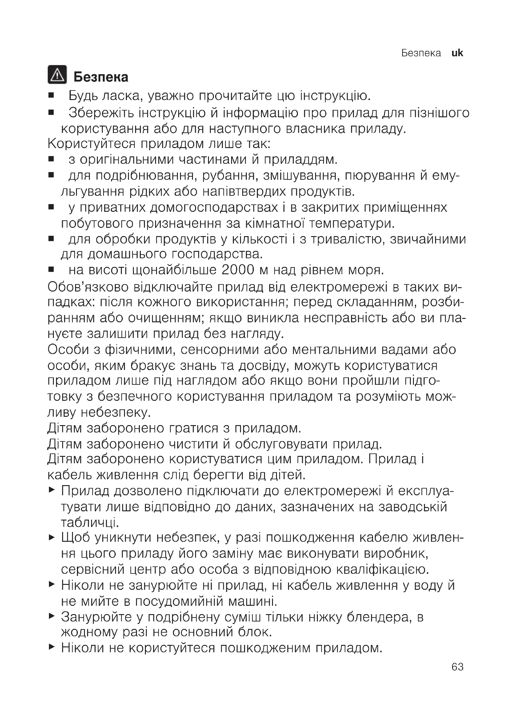 ¡ Будь ласка, уважно прочитайте цю інструкцію. ¡ Збережіть інструкцію й інформацію про прилад для пізнішого користування або для наступного власника приладу. Користуйтеся приладом лише так: ¡ з оригінальними частинами й приладдям. ¡ для подрібнювання, рубання, змішування, пюрування й ему- льгування рідких або напівтвердих продуктів. ¡ у приватних домогосподарствах і в закритих приміщеннях побутового призначення за кімнатної температури. ¡ для обробки продуктів у кількості і з тривалістю, звичайними для домашнього господарства. ¡ на висоті щонайбільше 2000м над рівнем моря. Обов’язково відключайте прилад від електромережі в таких ви- падках: після кожного використання; перед складанням, розби- ранням або очищенням; якщо виникла несправність або ви пла- нуєте залишити прилад без нагляду. Особи з фізичними, сенсорними або ментальними вадами або особи, яким бракує знань та досвіду, можуть користуватися приладом лише під наглядом або якщо вони пройшли підго- товку з безпечного користування приладом та розуміють мож- ливу небезпеку. Дітям заборонено гратися з приладом. Дітям заборонено чистити й обслуговувати прилад. Дітям заборонено користуватися цим приладом. Прилад і кабель живлення слід берегти від дітей.