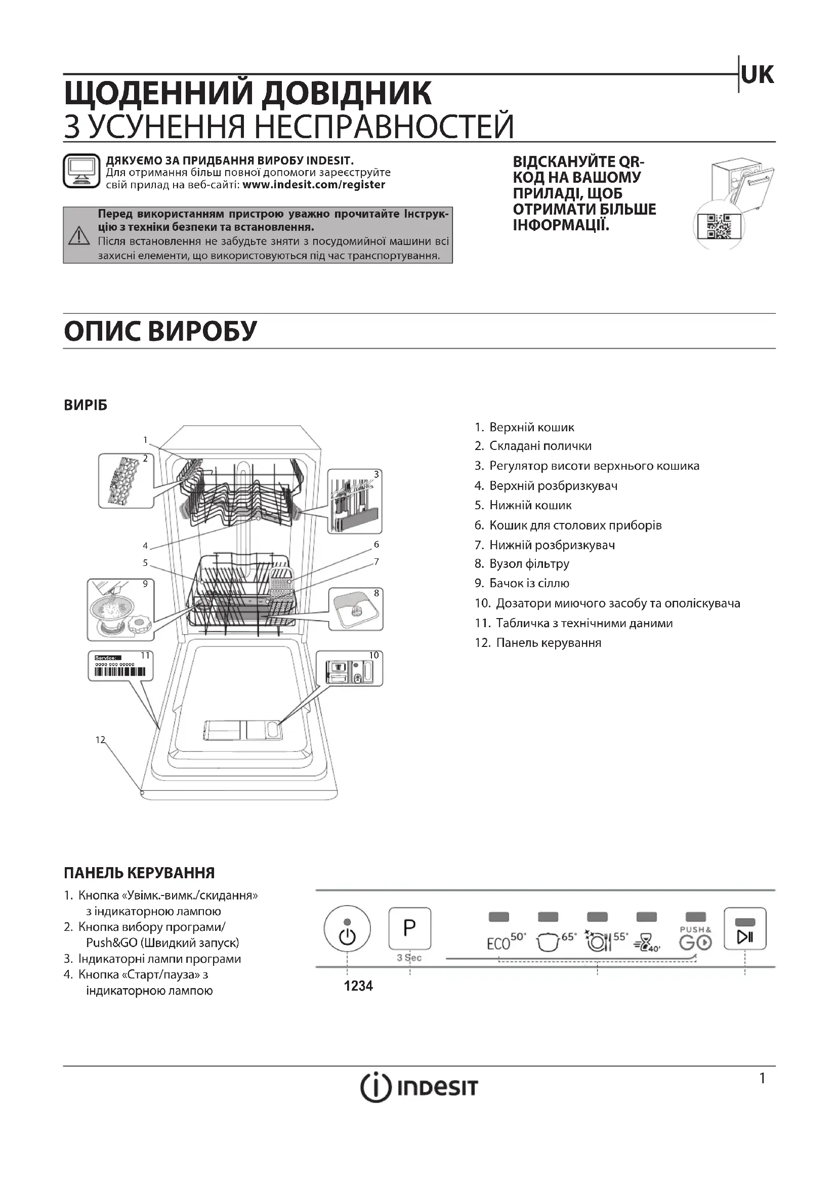 1. Верхній кошик2. Складані полички3. Регулятор висоти верхнього кошика4. Верхній розбризкувач5. Нижній кошик6. Кошик для столових приборів7. Нижній розбризкувач8. Вузол фільтру9. Бачок із сіллю10. Дозатори миючого засобу та ополіскувача11. Табличка з технічними даними12. Панель керування1. Кнопка «Увімк.-вимк./скидання» з індикаторною лампою2. Кнопка вибору програми/ Push&GO (Швидкий запуск)3. Індикаторні лампи програми4. Кнопка «Старт/пауза» з індикаторною лампою ЩОДЕННИЙ ДОВІДНИК З УСУНЕННЯ НЕСПРАВНОСТЕЙ ПАНЕЛЬ КЕРУВАННЯ ОПИС ВИРОБУ ДЯКУЄМО ЗА ПРИДБАННЯ ВИРОБУ INDESIT. Для отримання більш повної допомоги зареєструйте свій прилад на веб-сайті: www.indesit.com/registerПеред використанням пристрою уважно прочитайте Інструк-цію з техніки безпеки та встановлення.Після встановлення не забудьте зняти з посудомийної машини всі захисні елементи, що використовуються під час транспортування. ВІДСКАНУЙТЕ QR- КОД НА ВАШОМУ ПРИЛАДІ, ЩОБ ОТРИМАТИ БІЛЬШЕ ІНФОРМАЦІЇ. 0000 000 00000 Service: