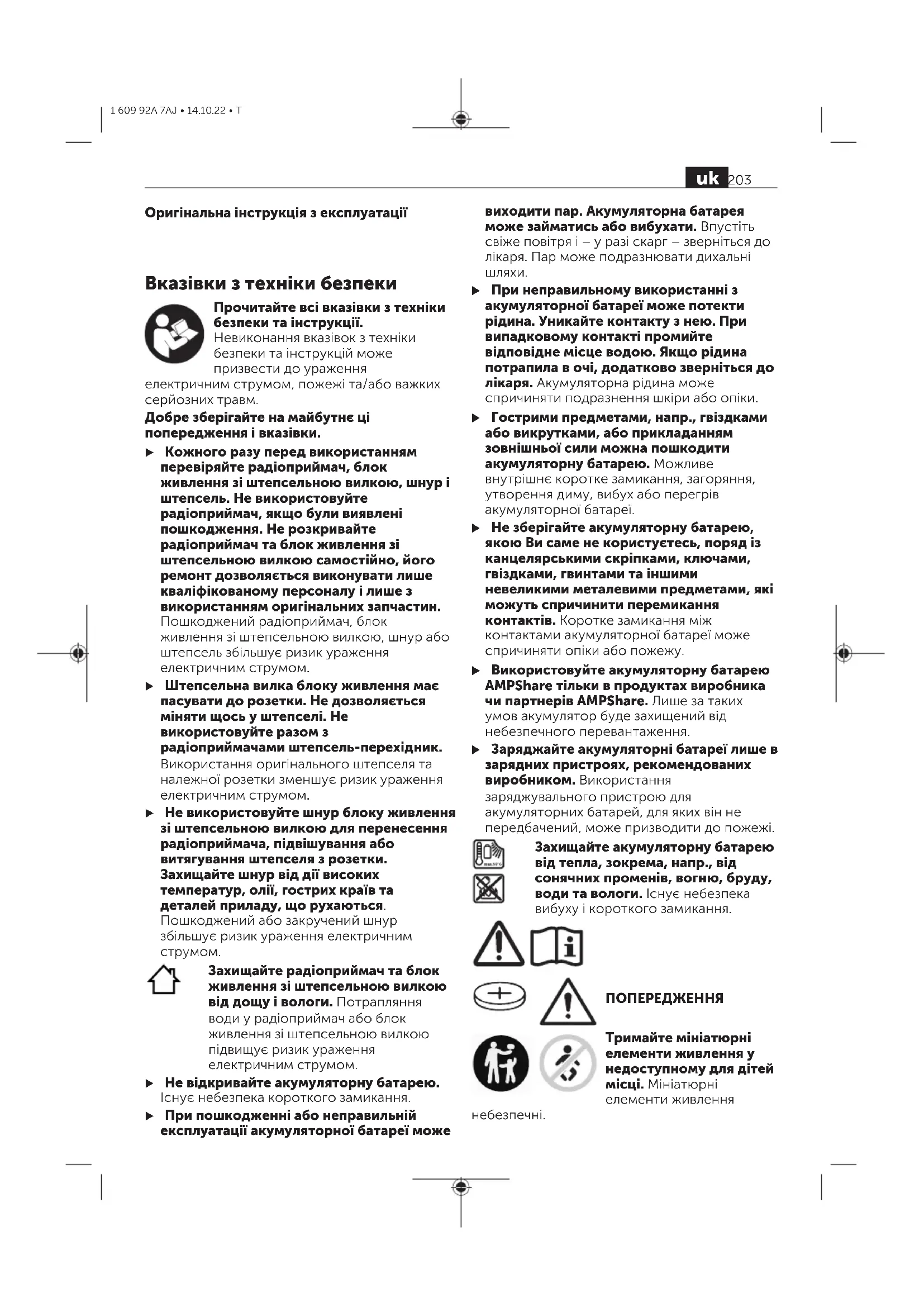 u При неправильному використанні з акумуляторної батареї може потекти рідина. Уникайте контакту з нею. При випадковому контакті промийте відповідне місце водою. Якщо рідина потрапила в очі, додатково зверніться до лікаря. Акумуляторна рідина може спричиняти подразнення шкіри або опіки. u Гострими предметами, напр., гвіздками або викрутками, або прикладанням зовнішньої сили можна пошкодити акумуляторну батарею. Можливе внутрішнє коротке замикання, загоряння, утворення диму, вибух або перегрів акумуляторної батареї. u Не зберігайте акумуляторну батарею, якою Ви саме не користуєтесь, поряд із канцелярськими скріпками, ключами, гвіздками, гвинтами та іншими невеликими металевими предметами, які можуть спричинити перемикання контактів. Коротке замикання між контактами акумуляторної батареї може спричиняти опіки або пожежу. u Використовуйте акумуляторну батарею AMPShare тільки в продуктах виробника чи партнерів AMPShare. Лише за таких умов акумулятор буде захищений від небезпечного перевантаження. u Заряджайте акумуляторні батареї лише в зарядних пристроях, рекомендованих виробником. Використання заряджувального пристрою для акумуляторних батарей, для яких він не передбачений, може призводити до пожежі. Захищайте акумуляторну батарею від тепла, зокрема, напр., від сонячних променів, вогню, бруду, води та вологи. Існує небезпека вибуху і короткого замикання. ПОПЕРЕДЖЕННЯ Тримайте мініатюрні елементи живлення у недоступному для дітей місці. Мініатюрні елементи живлення небезпечні. uk 203 1 609 92A 7AJ • 14.10.22 • Tu Мініатюрні елементи живлення не можна ковтати або вводити в інші природні отвори тіла. У разі підозри на проковтування мініатюрного елемента живлення або його введення крізь інші природні отвори негайно зверніться до лікаря. Проковтування мініатюрного елемента живлення може протягом 2годин призвести до важких внутрішніх опіків і