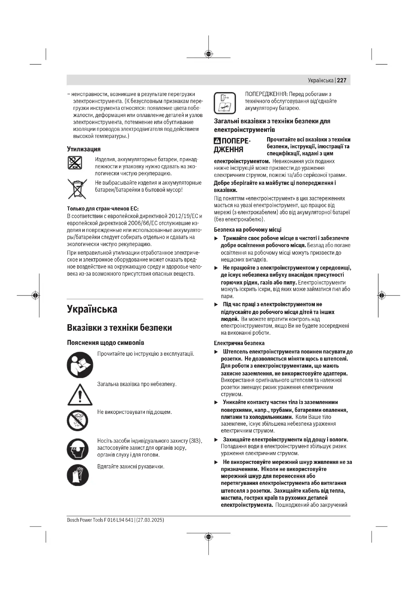 u Тримайте рукоятки і поверхні захвату сухими і чистими, слідкуйте, щоб на них не було оливи або густого мастила. Слизькі рукоятки і поверхні захвату унеможливлюють безпечне поводження з електроінструментом та його контролювання в неочікуваних ситуаціях. F 016 L94 641 | (27.03.2025) Bosch Power ToolsУкраїнська | 229 Правильне поводження та користування електроінструментами, що працюють на акумуляторних батареях u Заряджайте акумуляторні батареї лише в заряджувальних пристроях, рекомендованих виготовлювачем. Використання заряджувального пристрою для акумуляторних батарей, для яких він не передбачений, може призводити до пожежі. u Використовуйте в електроінструментах лише рекомендовані акумуляторні батареї. Використання інших акумуляторних батарей може призводити до травм та пожежі. u Не зберігайте акумуляторну батарею, якою Ви саме не користуєтеся, поряд із канцелярськими скріпками, ключами, цвяхами, гвинтами та іншими невеликими металевими предметами, які можуть спричинити перемикання контактів. Коротке замикання між контактами акумуляторної батареї може спричиняти опіки або пожежу. u При неправильному використанні з акумуляторної батареї може потекти рідина. Уникайте контакту з нею. При випадковому контакті промийте відповідне місце водою. Якщо рідина потрапила в очі, додатково зверніться до лікаря. Акумуляторна рідина може спричиняти подразнення шкіри або