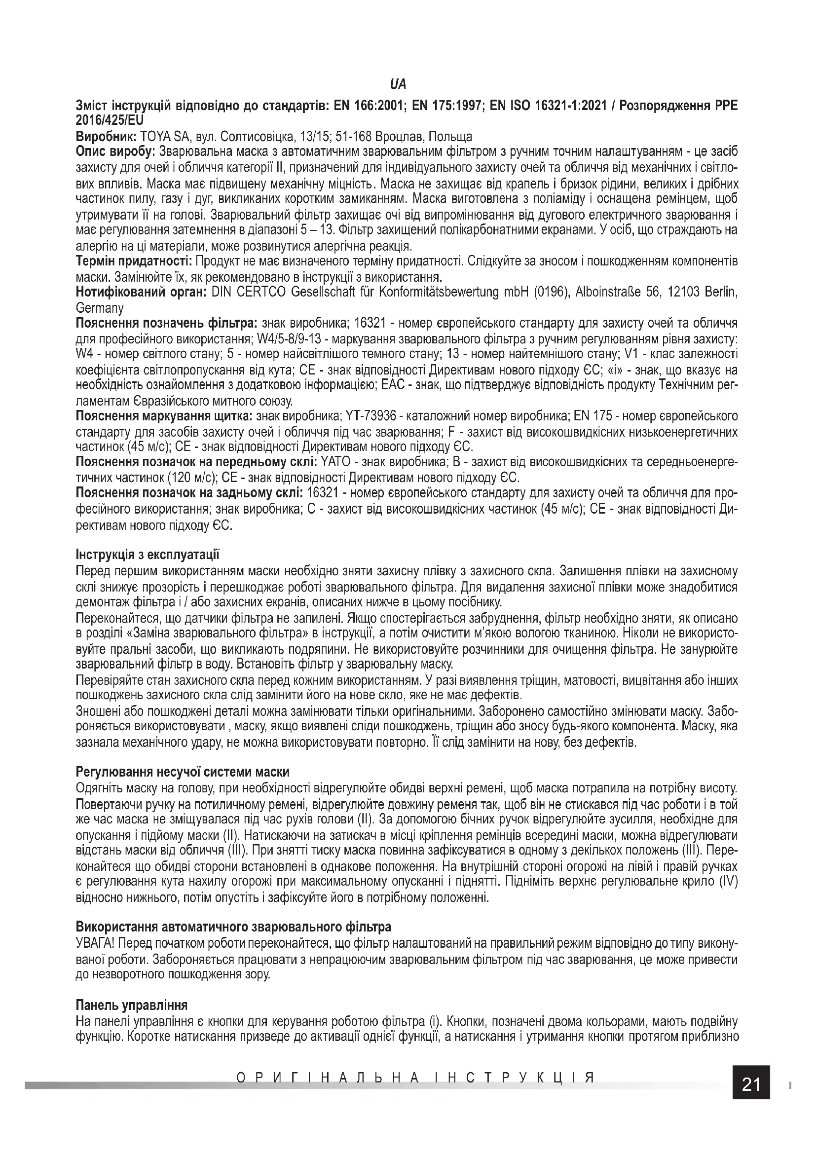 Зміст інструкцій відповідно до стандартів: EN 166:2001; EN 175:1997; EN ISO 16321-1:2021 / Розпорядження PPE 2016/425/EU Виробник: TOYA SA, вул. Солтисовіцка, 13/15; 51-168 Вроцлав, Польща Опис виробу: Зварювальна маска з автоматичним зварювальним фільтром з ручним точним налаштуванням - це засіб захисту для очей і обличчя категорії II, призначений для індивідуального захисту очей та обличчя від механічних і світло- вих впливів. Маска має підвищену механічну міцність . Маска не захищає від крапель і бризок рідини, великих і дрібних частинок пилу, газу і дуг, викликаних коротким замиканням. Маска виготовлена з поліаміду і оснащена ремінцем, щоб утримувати її на голові. Зварювальний фільтр захищає очі від випромінювання від дугового електричного зварювання і має регулювання затемнення в діапазоні 5 – 13. Фільтр захищений полікарбонатними екранами. У осіб, що страждають на алергію на ці матеріали, може розвинутися алергічна реакція. Термін придатності: Продукт не має визначеного терміну придатності. Слідкуйте за зносом і пошкодженням компонентів маски. Замінюйте їх, як рекомендовано в інструкції з використання. Нотифікований орган: DIN CERTCO Gesellschaft für Konformitätsbewertung mbH (0196), Alboinstraße 56, 12103 Berlin, Germany Пояснення позначень фільтра: знак виробника; 16321 - номер європейського стандарту для захисту очей та обличчя для професійного використання; W4/5-8/9-13 - маркування зварювального фільтра з ручним регулюванням рівня захисту: W4 - номер світлого стану; 5 - номер найсвітлішого темного стану; 13 - номер найтемнішого стану; V1 - клас залежності коефіцієнта світлопропускання від кута; CE - знак відповідності Директивам нового підходу ЄС; «i» - знак, що вказує на необхідність ознайомлення з додатковою інформацією; EAC - знак, що підтверджує відповідність продукту Технічним рег- ламентам Євразійського митного союзу. Пояснення маркування щитка: знак виробника; YT-73936 - каталожний номер виробника; EN 175 - номер європейського стандарту для засобів захисту очей і обличчя під час зварювання; F - захист від високошвидкісних низькоенергетичних частинок (45 м/с); CE - знак відповідності Директивам нового підходу ЄС. Пояснення позначок на передньому склі: YATO - знак виробника; B - захист від високошвидкісних та середньоенерге- тичних частинок (120 м/с); CE - знак відповідності Директивам нового підходу ЄС. Пояснення позначок на задньому склі: 16321 - номер європейського стандарту для захисту очей та обличчя для про- фесійного використання; знак виробника; C - захист від високошвидкісних частинок (45 м/с); CE - знак відповідності Ди- рективам нового підходу ЄС. Інструкція з експлуатації Перед першим використанням маски необхідно зняти захисну плівку з захисного скла. Залишення плівки на захисному склі знижує прозорість і перешкоджає роботі зварювального фільтра. Для видалення захисної плівки може знадобитися демонтаж фільтра і / або захисних екранів, описаних нижче в цьому посібнику. Переконайтеся, що датчики фільтра не запилені. Якщо спостерігається забруднення, фільтр необхідно зняти, як описано в розділі «Заміна зварювального фільтра» в інструкції, а потім очистити м’якою вологою тканиною. Ніколи не використо- вуйте пральні засоби, що викликають подряпини. Не використовуйте розчинники для очищення фільтра. Не занурюйте зварювальний фільтр в воду. Встановіть фільтр у зварювальну маску. Перевіряйте стан захисного скла перед 