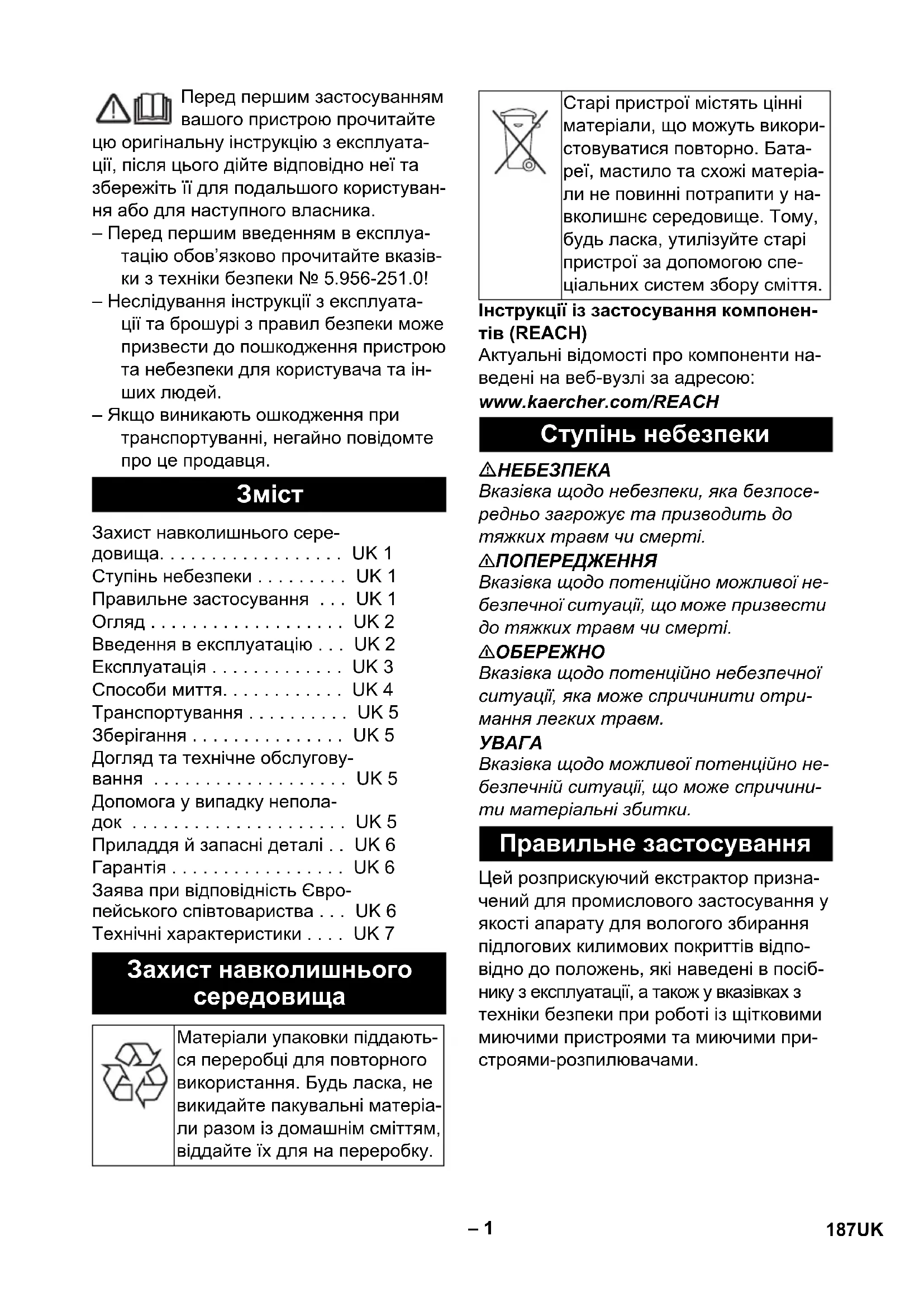 – Якщо виникають ошкодження при транспортуванні, негайно повідомте про це продавця. Інструкції із застосування компонен- тів (REACH) Актуальні відомості про компоненти на- ведені на веб-вузлі за адресою: www.kaercher.com/REACH